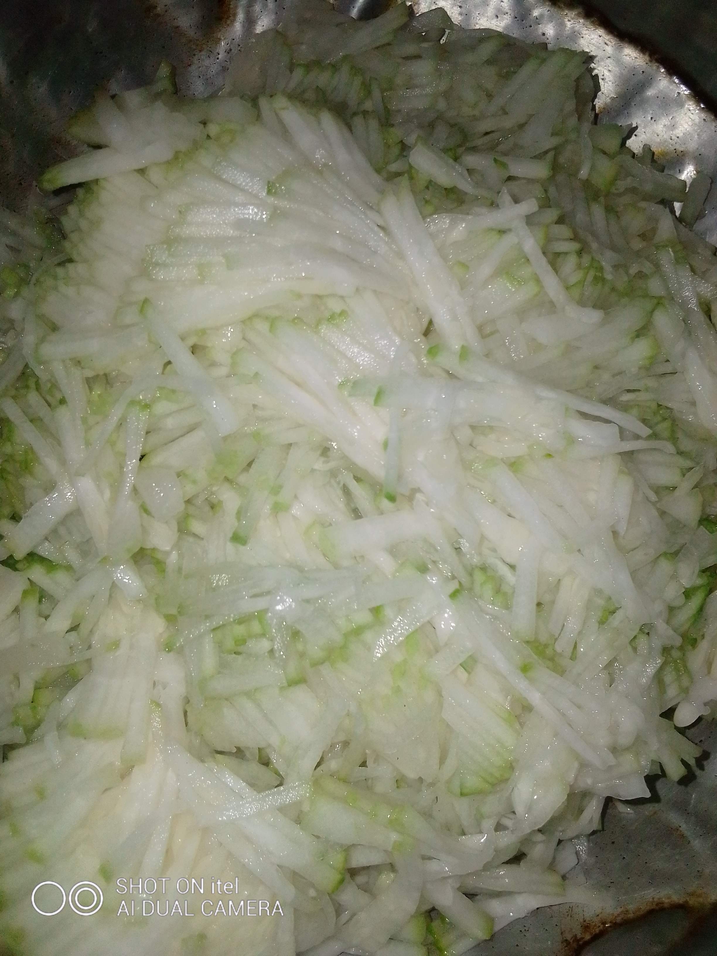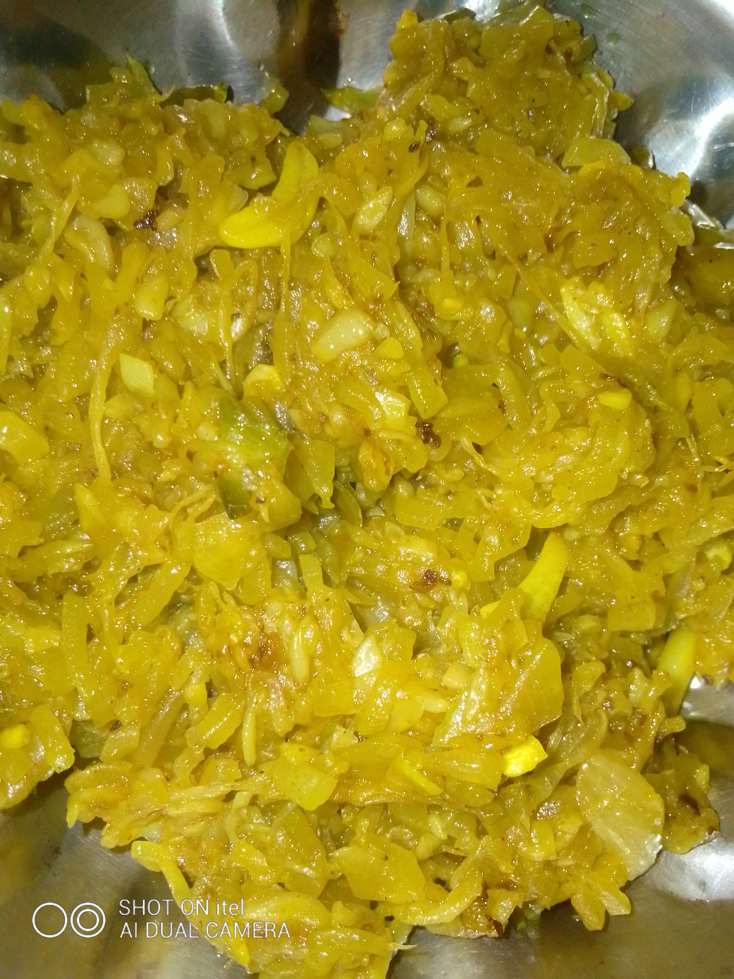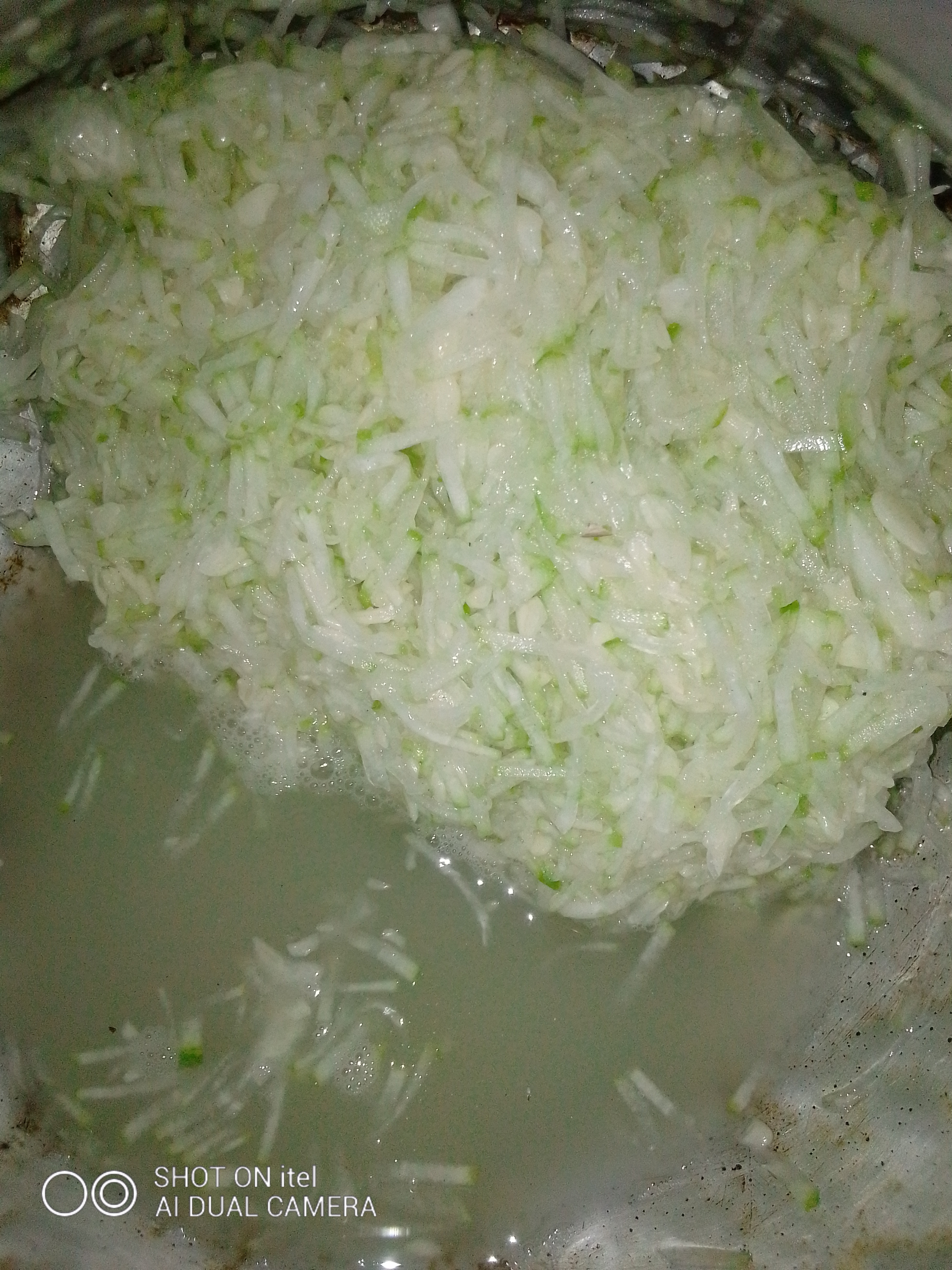 তারপর মাখিয়ে রাখা চাল কুমড়ো তেলের উপর ছাড়ার পর তাতে একে একে হলুদগুড়া ও লবণ দিয়ে ভালো করে নাড়তে হবে।