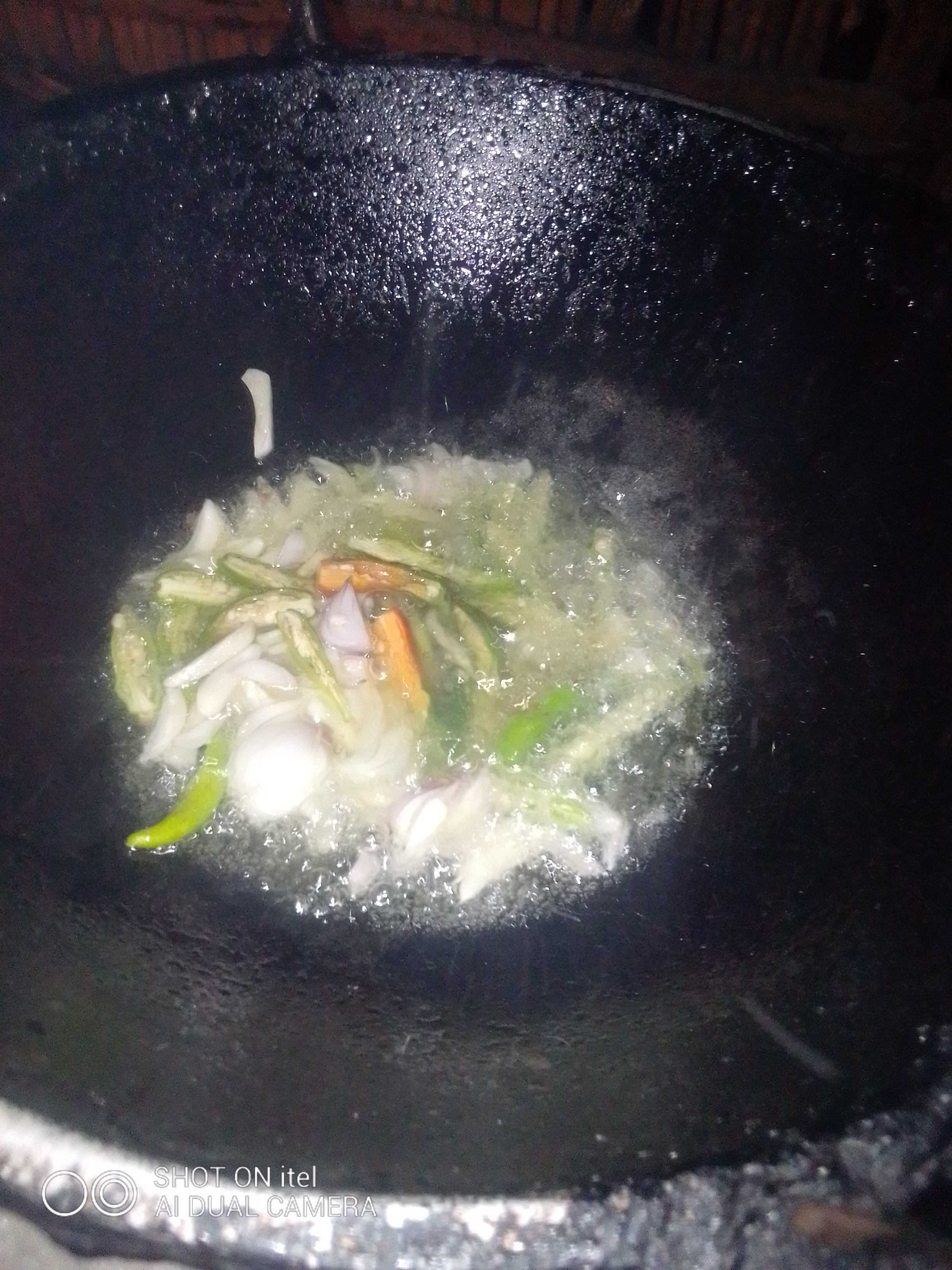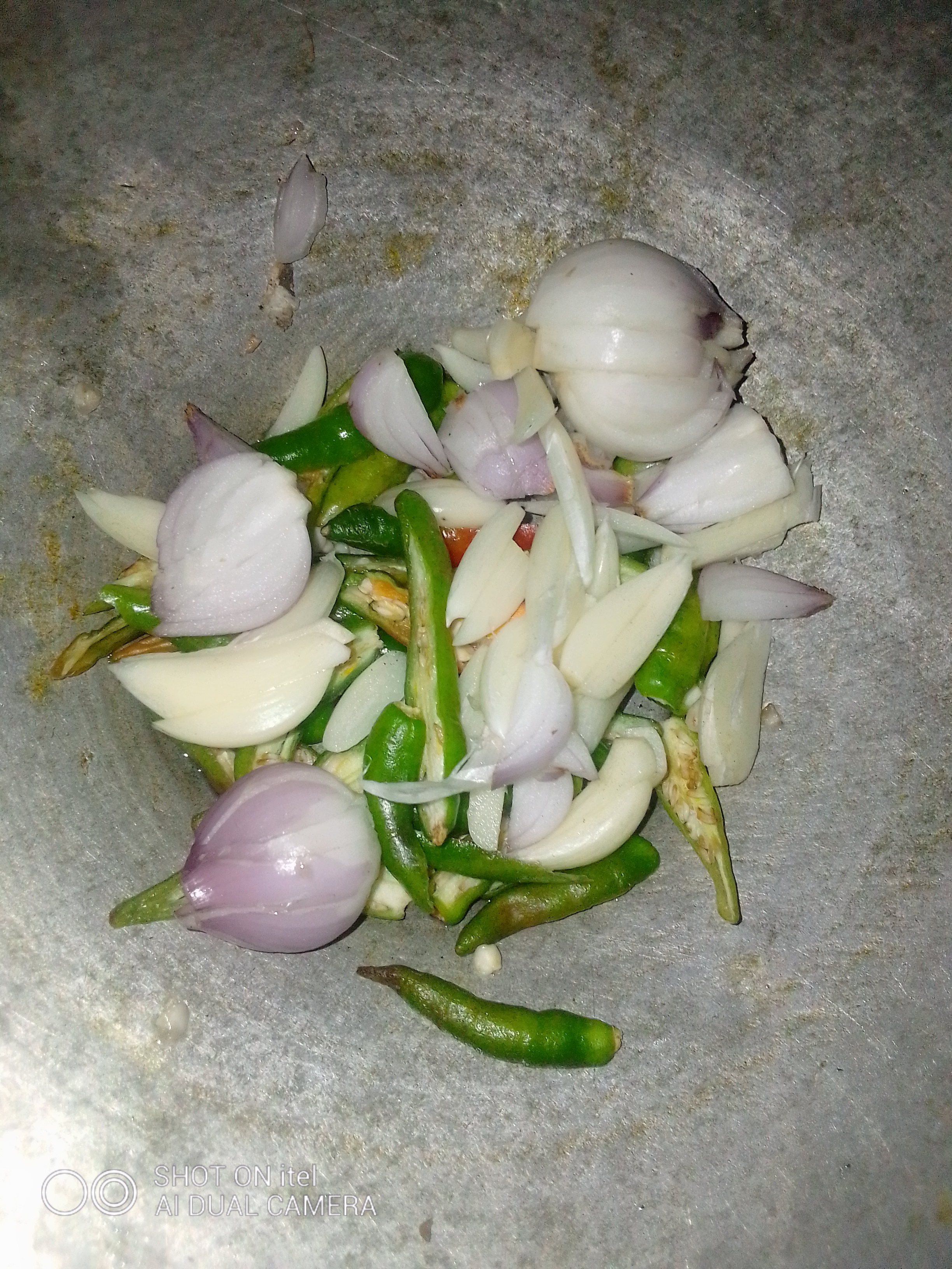 এবার চুলাতে একটা কড়াই বসিয়ে দিয়ে তাতে পরিমাণ মতো তেল দিয়ে গরম করে নিতে হবে। তাতে কেটে রাখা পিঁয়াজ রসুন ও কাঁচা মরিচ গুলো তেলের উপর ছাড়তে হবে।