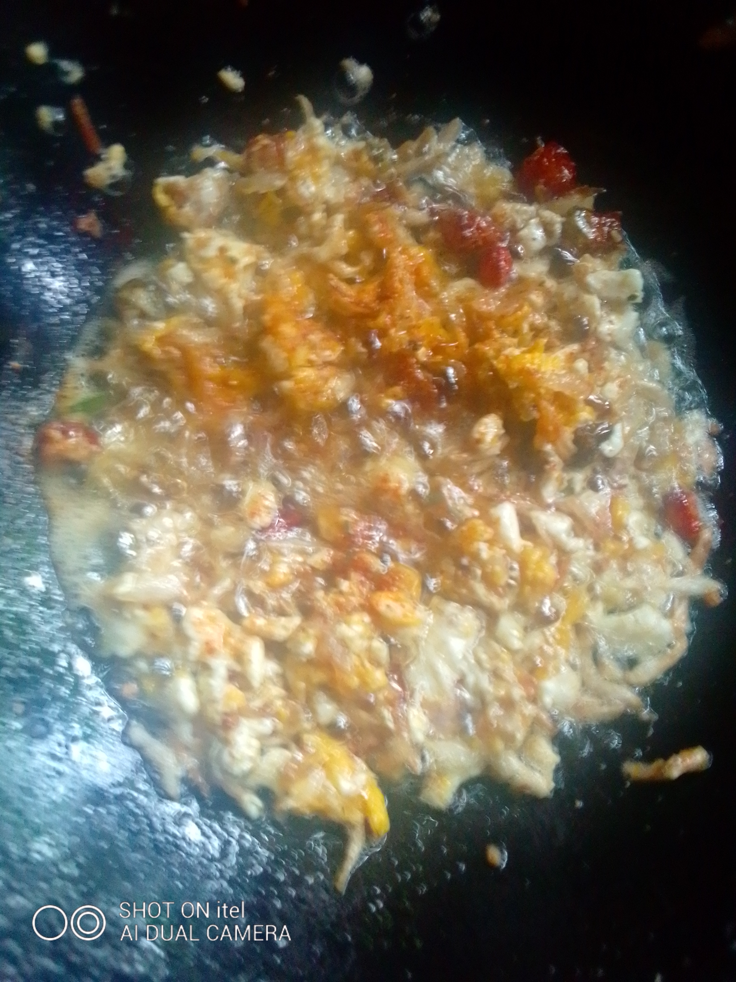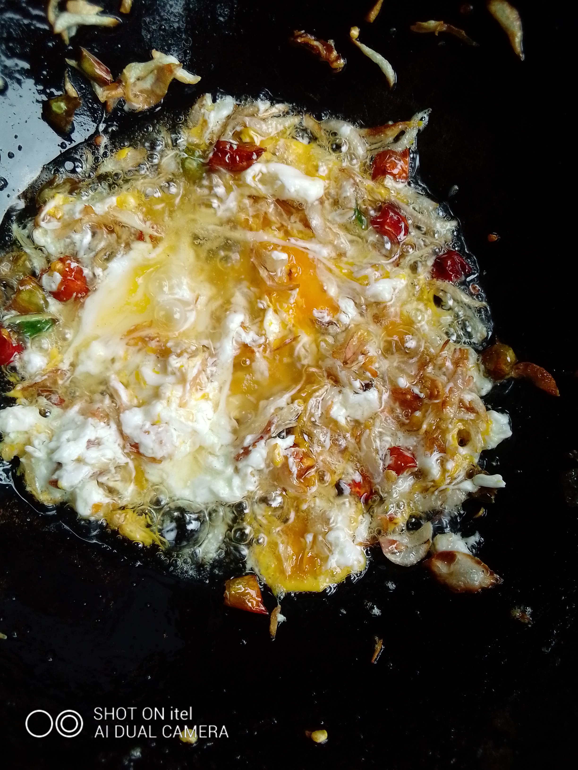 এবার চুলাতে একটা কড়াই বসিয়ে দিয়ে তাতে পরিমাণ মতো তেল দিয়ে গরম করে নিতে হবে। এরপর কেটে রাখা পিঁয়াজ মরিচ গরম তেলে ছারতে হবে। তার মধ্যে একটি ডিম দিয়ে নাড়াচাড়া করতে হবে