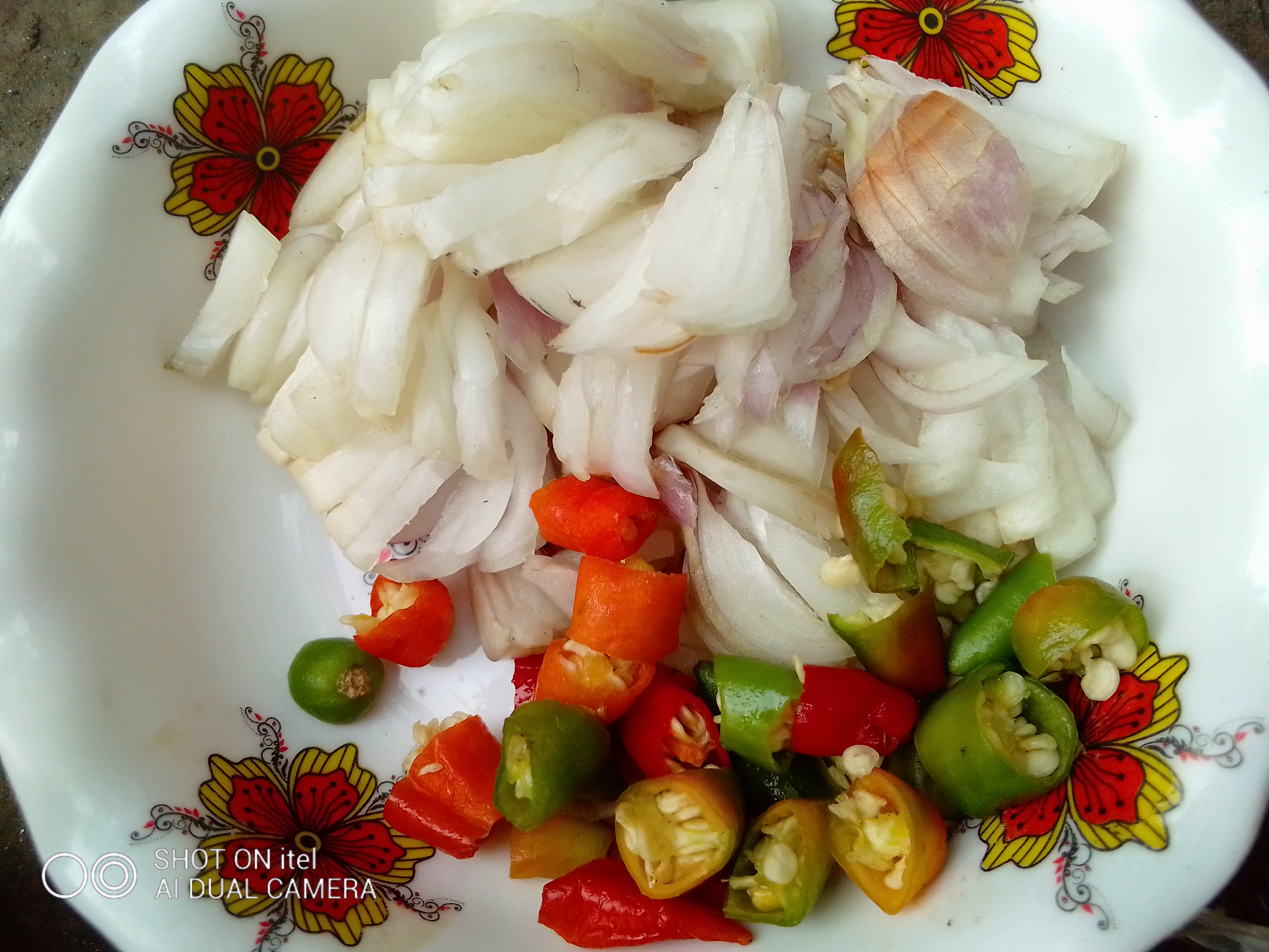 এরপর পিঁয়াজ কুচি করে কেটে নিতে হবে। তারপর মরিচ গোল গোল করে কাটতে হবে।