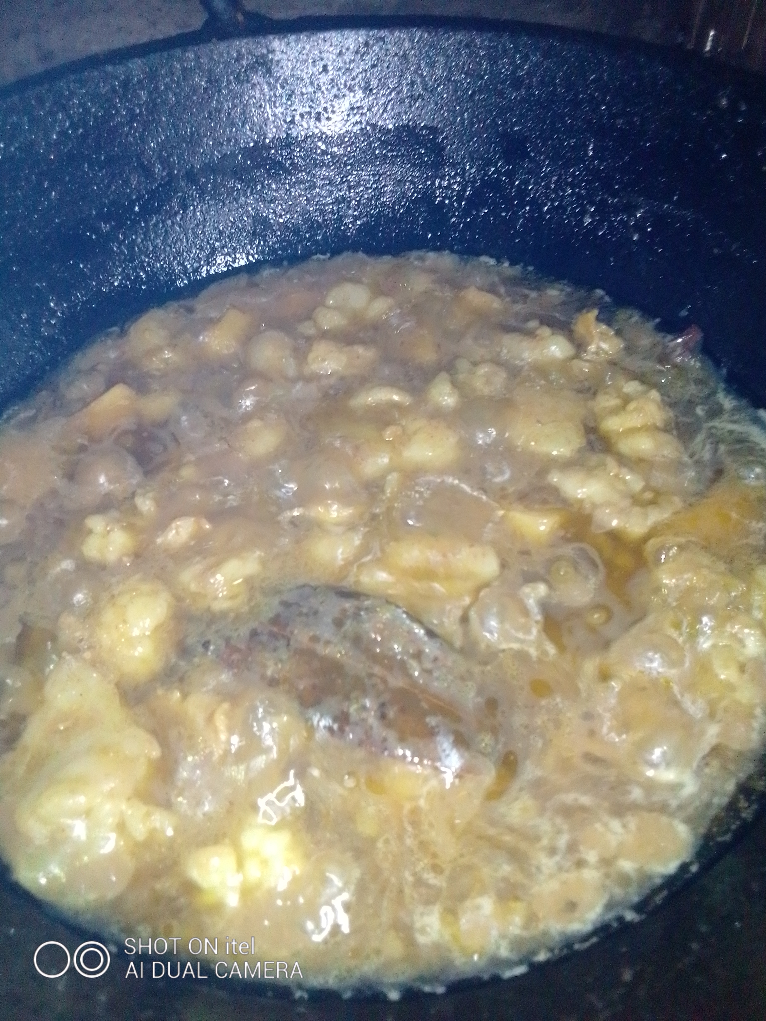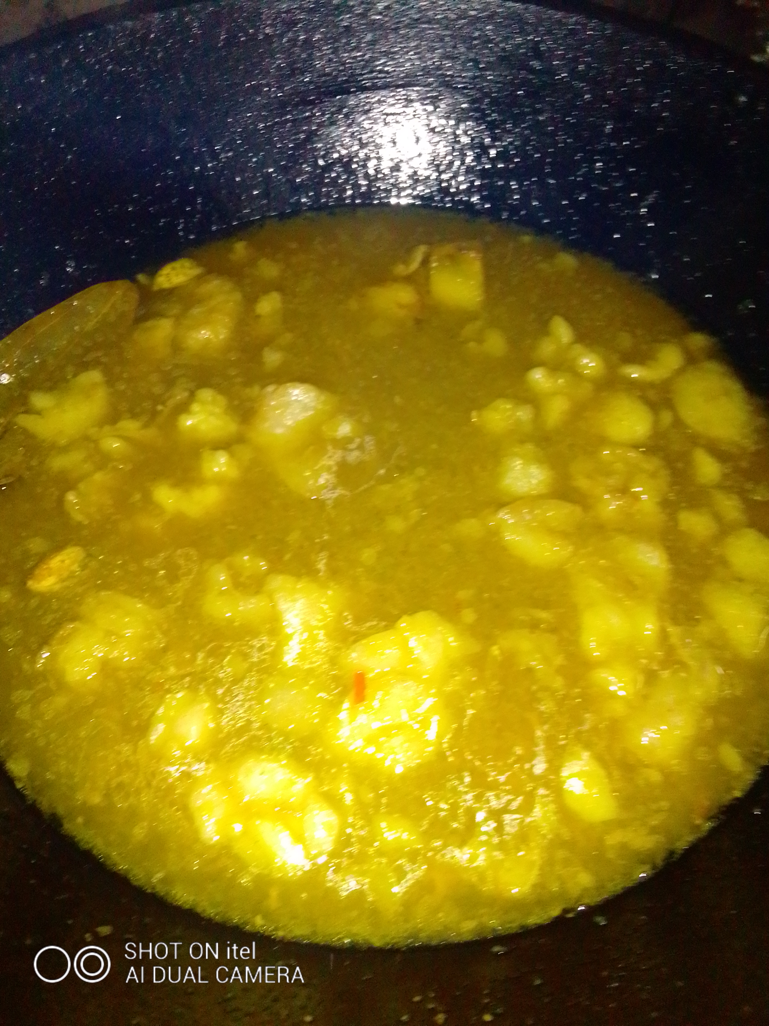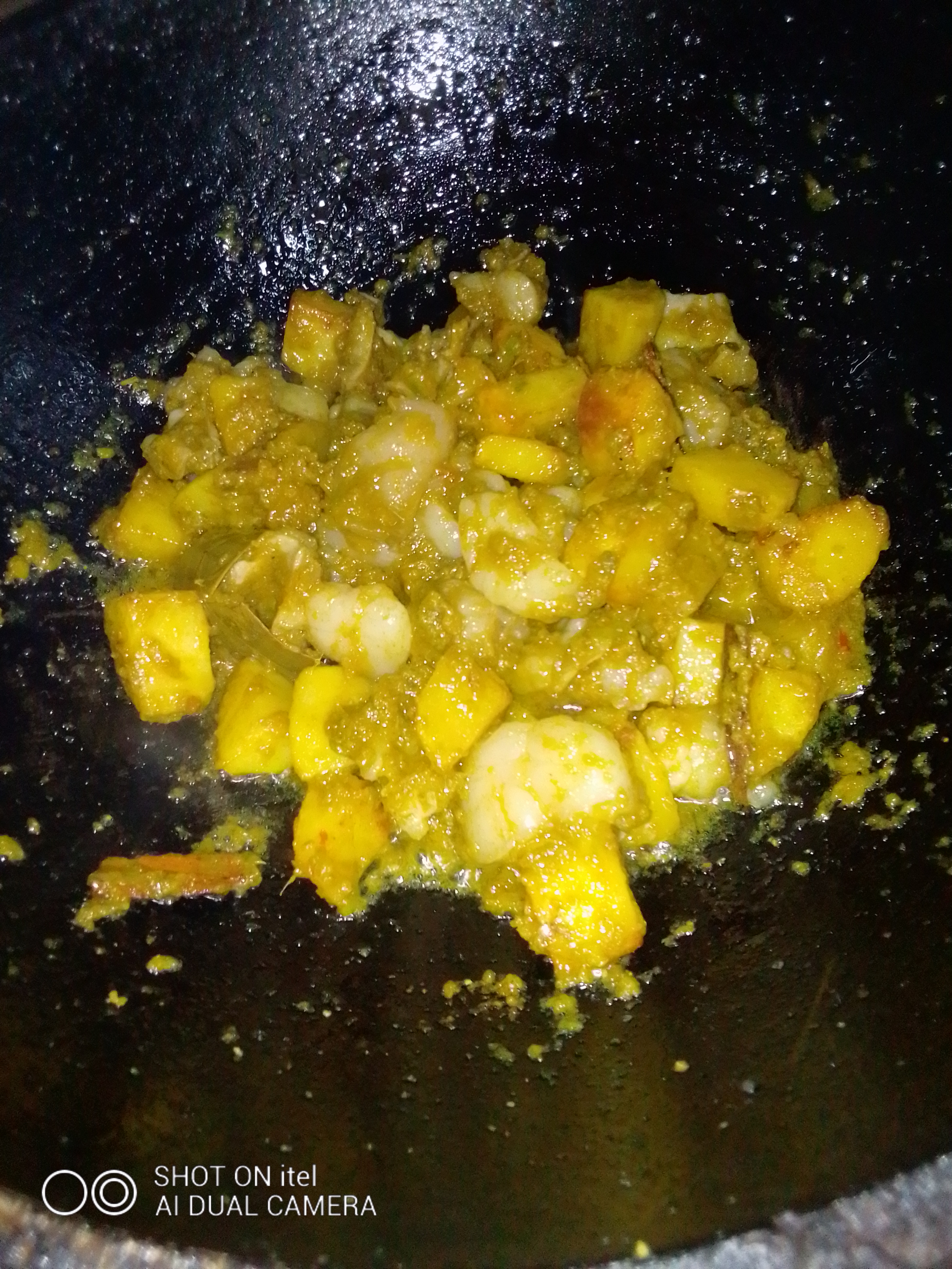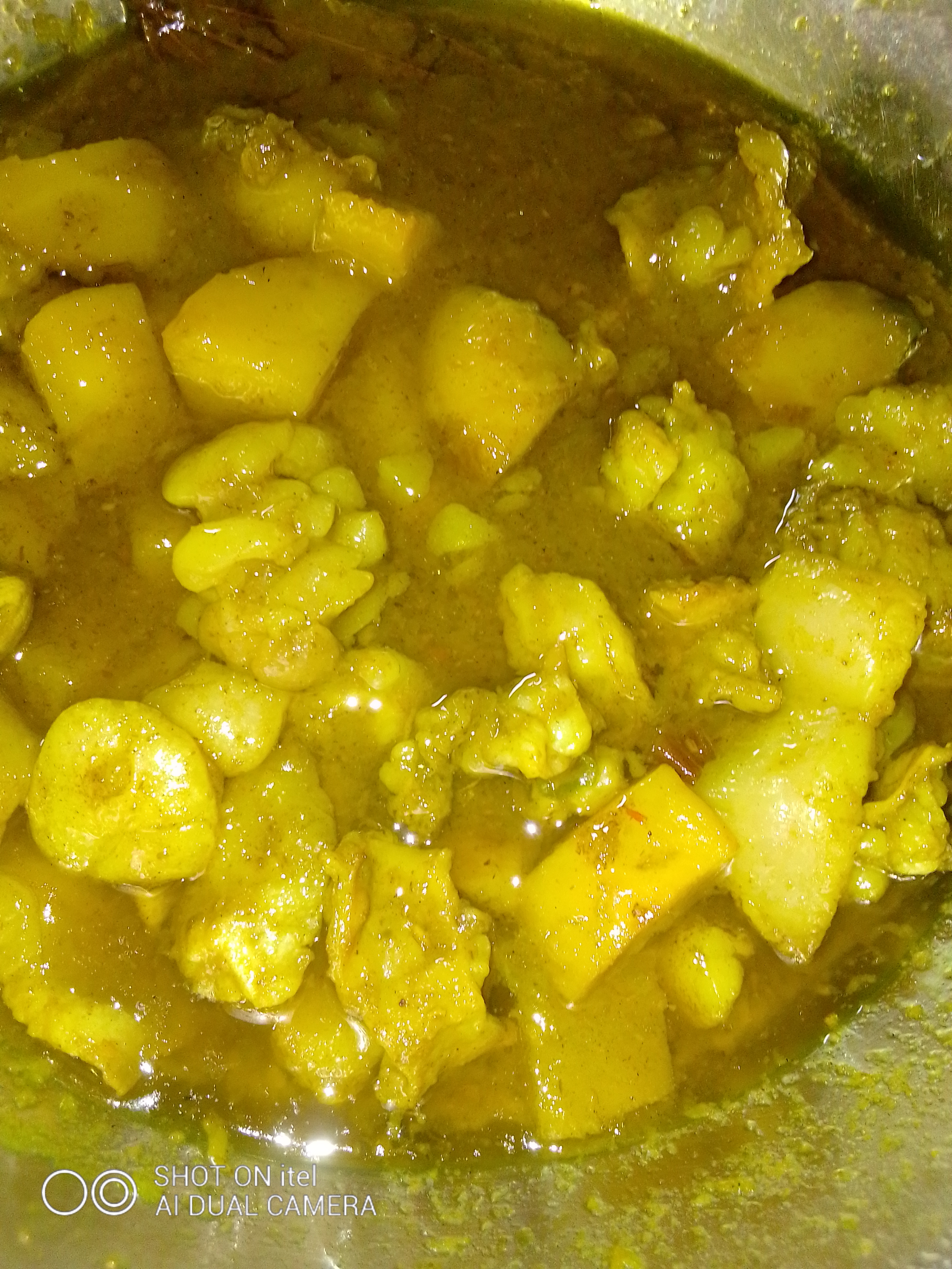 তারপর মসলাগুলো তেলে উপর ছেড়ে দিয়ে ভালো করে কষাতে হবে। কষানোর পর ভেজে রাখা আলুওচড়বি দিয়ে কষাতে হবে। কষানো হয়ে গেলে তাতে পরিমাণ মতো পানি দিয়ে দিতে হবে।