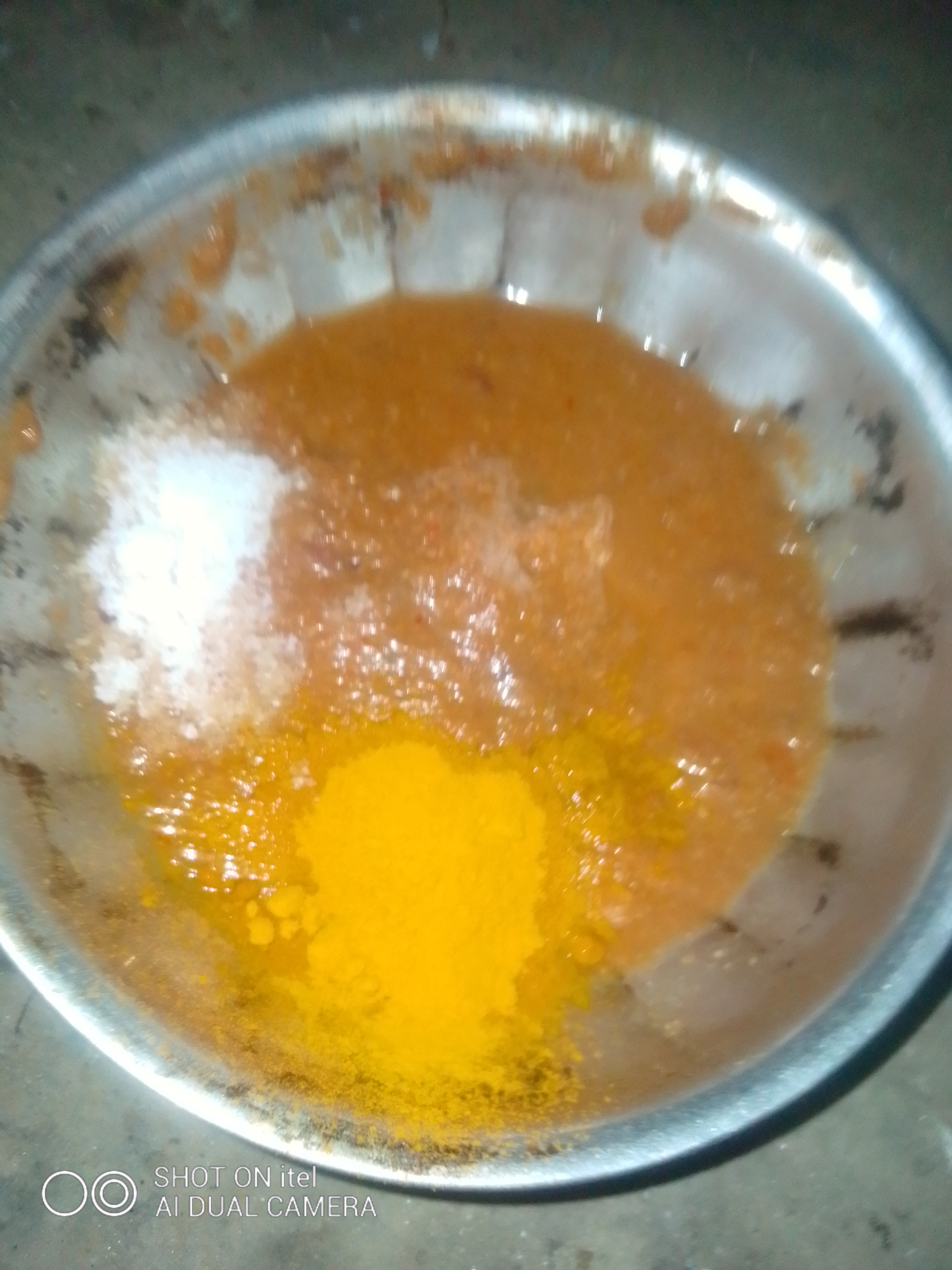 পিঁয়াজ রসুন কেটে নিয়ে শুকনো মরিচ এক সাথে বেটে নিতে হবে। বাটার মধ্যে একে একে হলুদগুড়া জিরাগুঁড়া ওলবণ দিতে হবে।