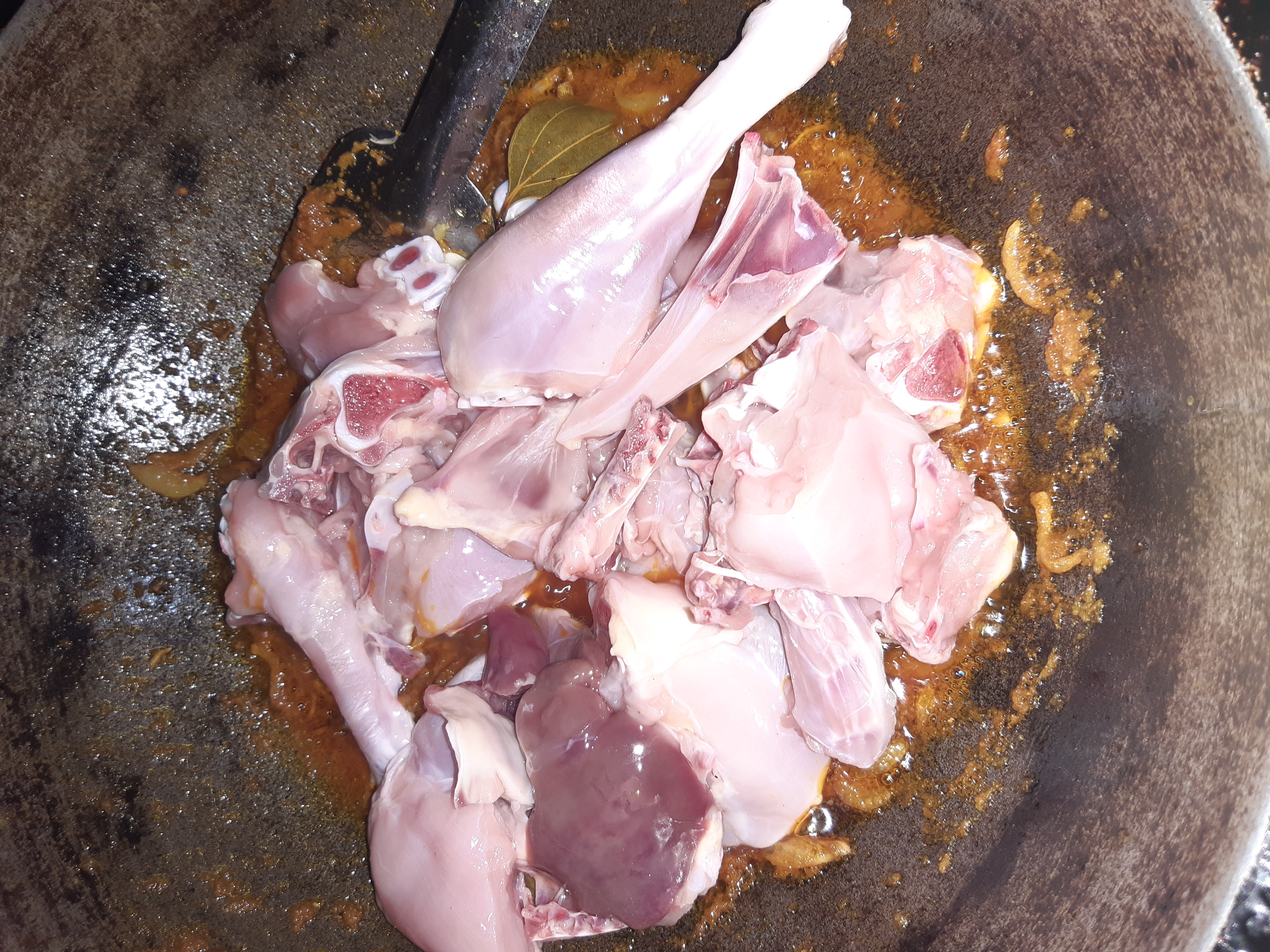 এখন কেটে দেখা মুরগির মাংস গুলো কড়াইয়ের ভেতর দিয়ে ভালোভাবে নেড়ে চেড়ে মিশিয়ে নেই।