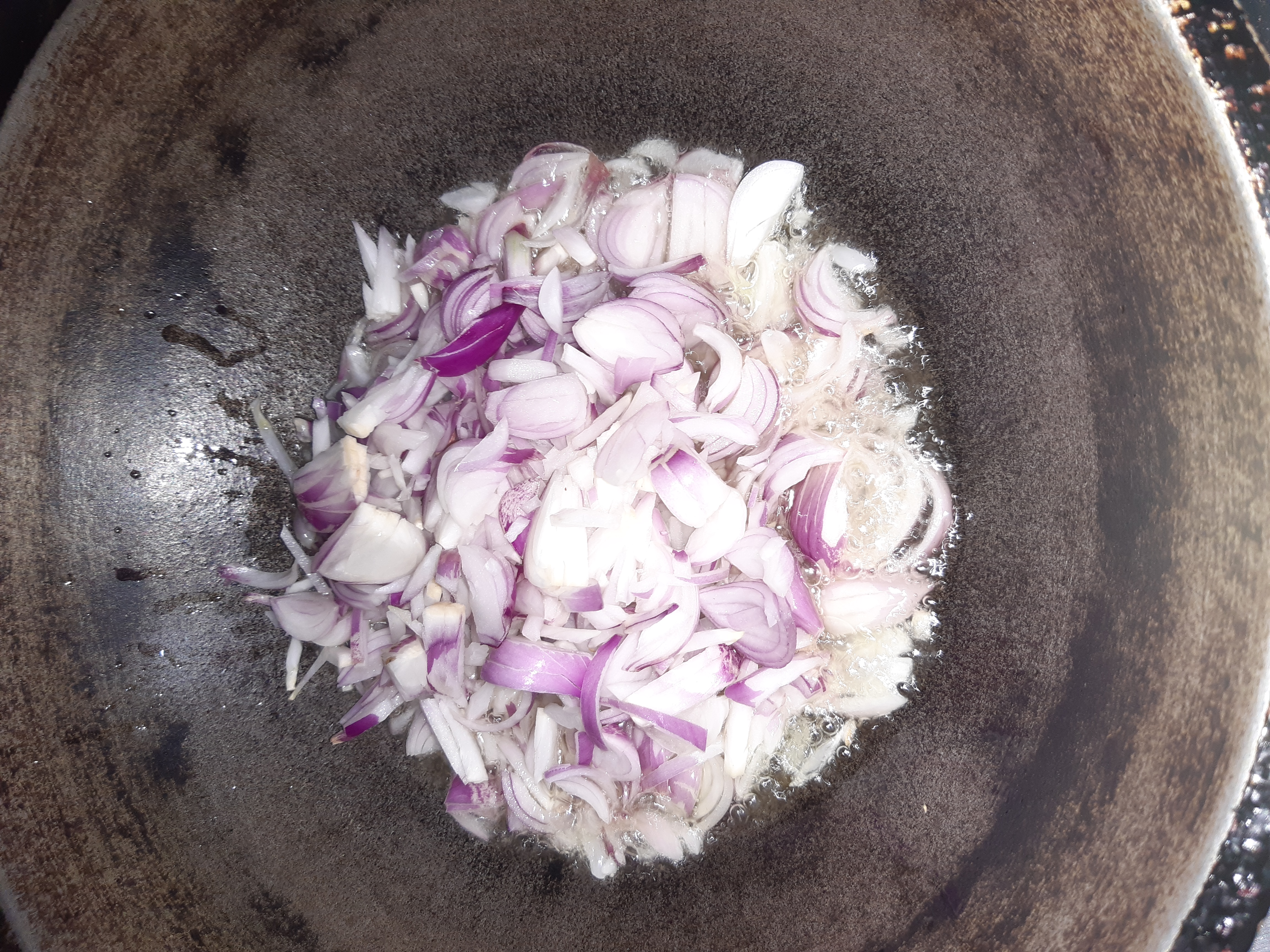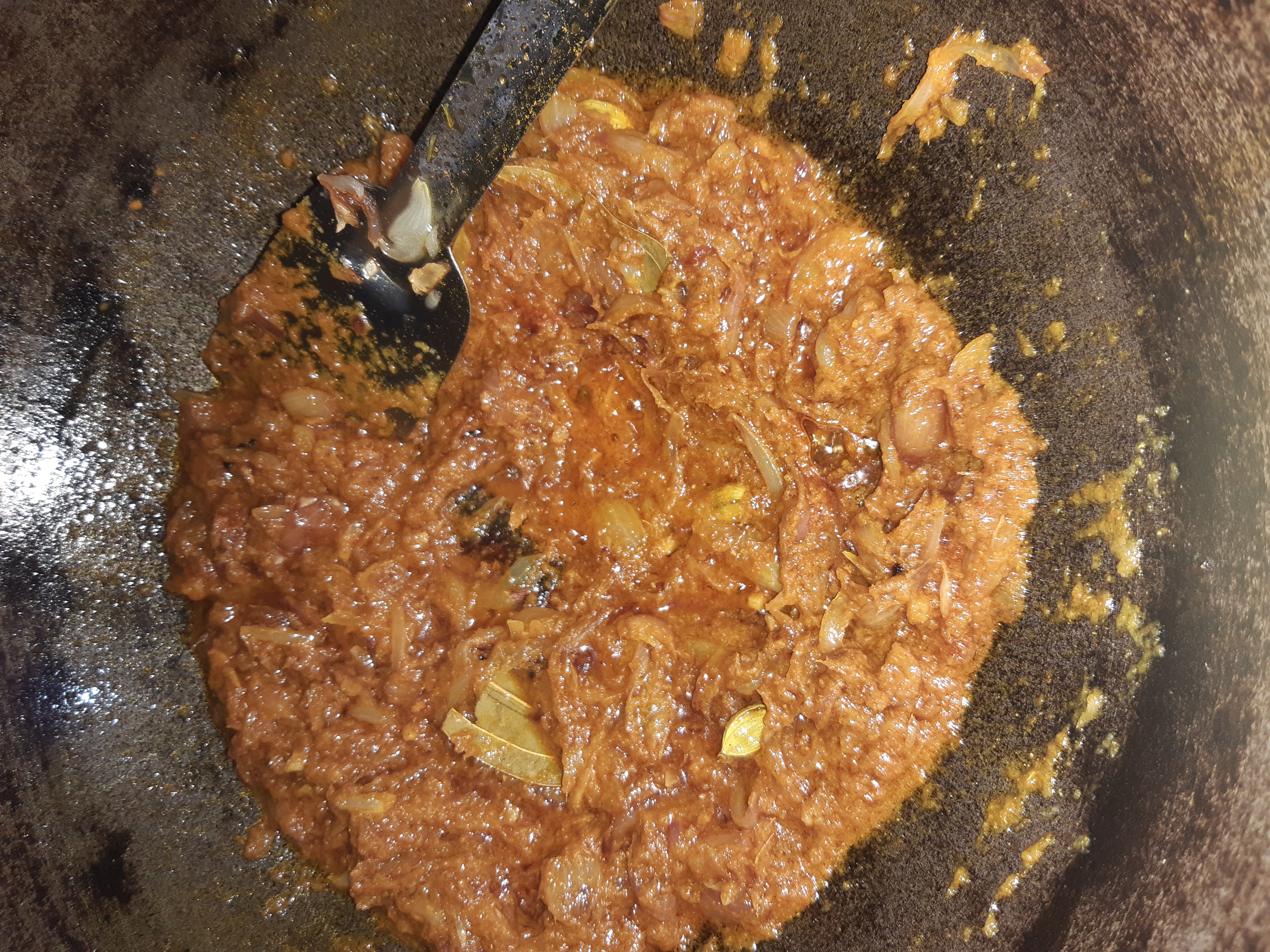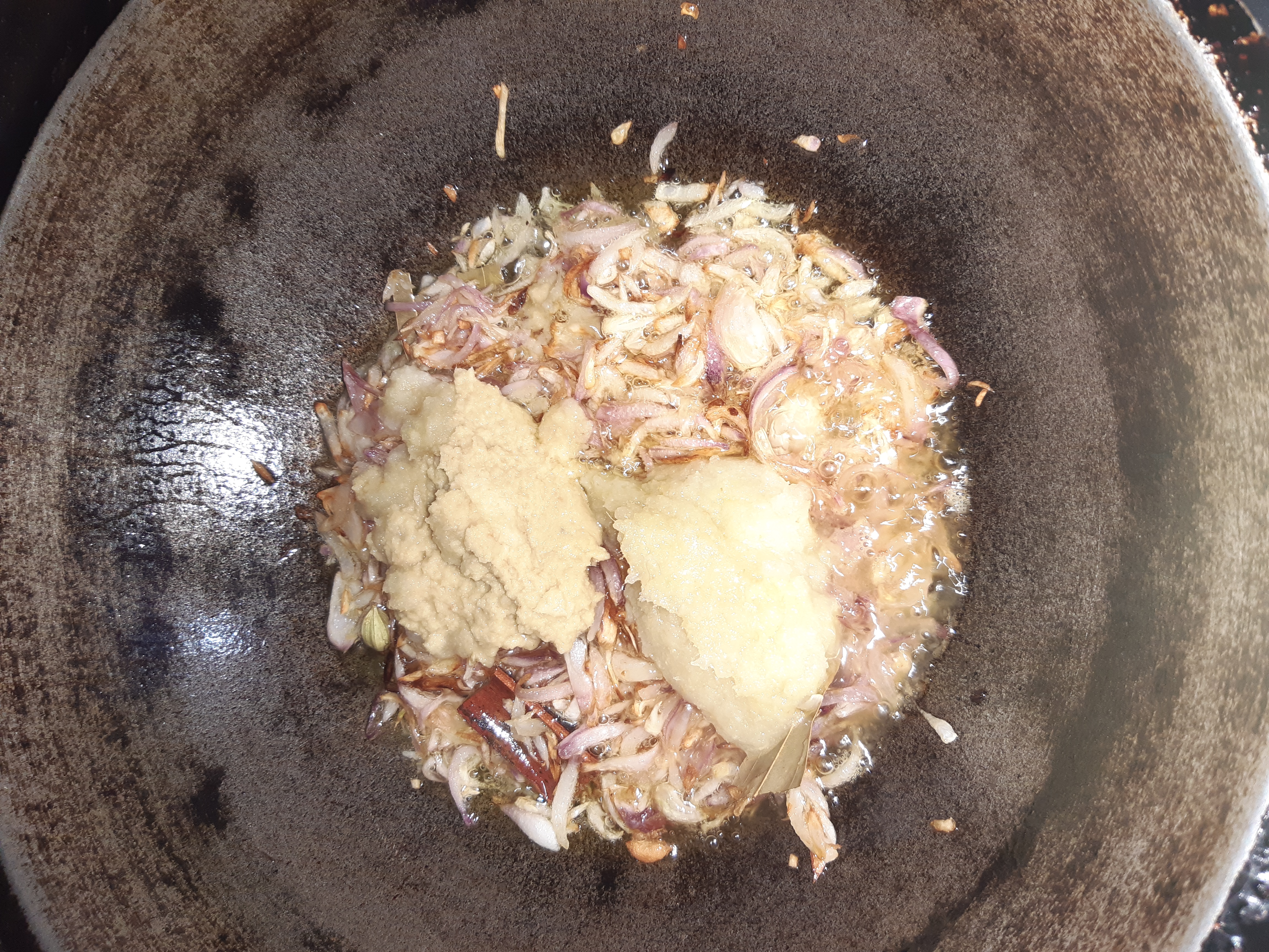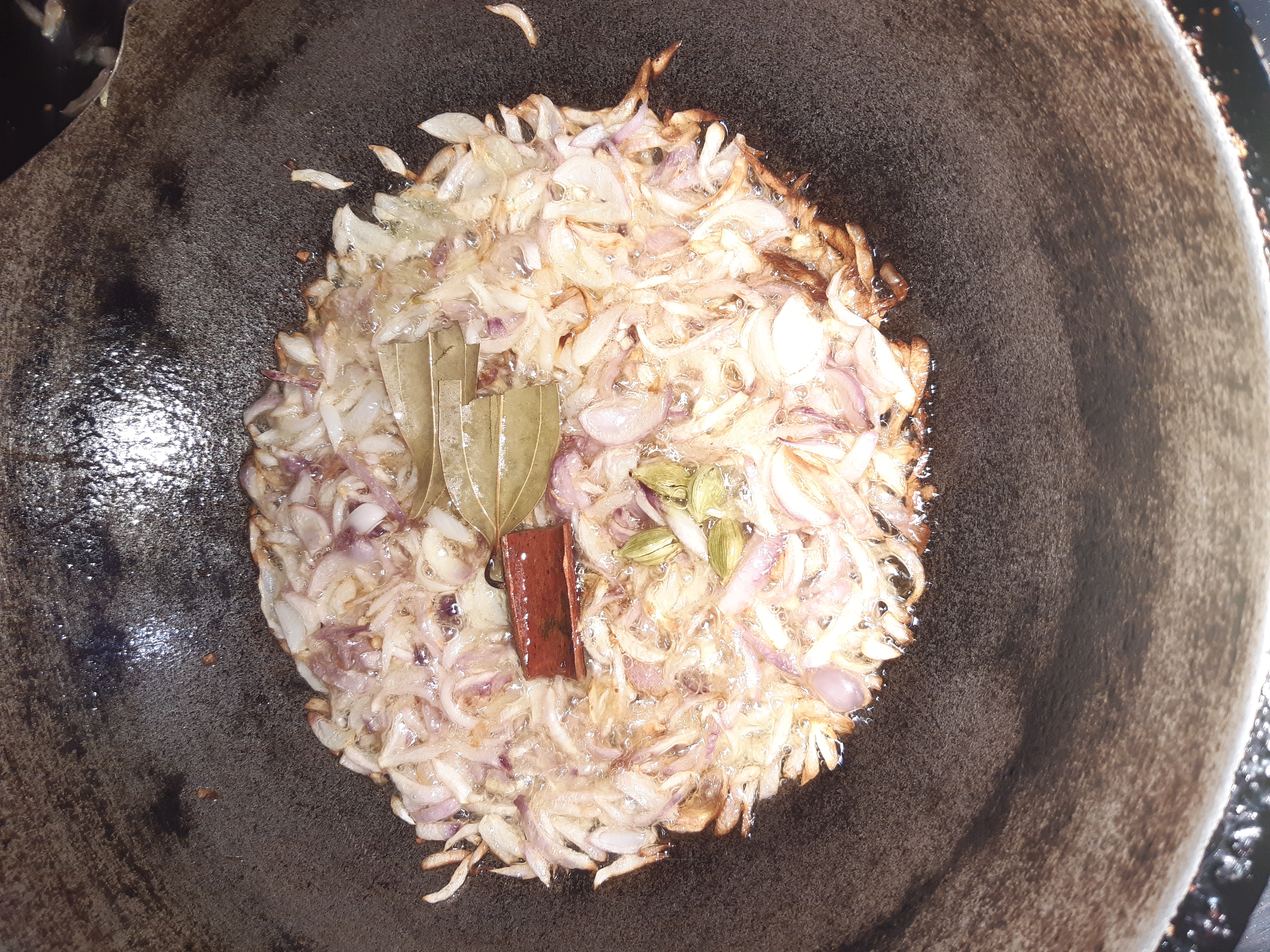 প্রথমে একটি কড়াইতে কেটে রাখা পেঁয়াজ, দারচিনি এবং তেজপাতা একসাথে দিয়ে কিছুক্ষণ ভেজে নিই। খেয়াল রাখতে হবে যেন বেশি ভাজা হয়ে না যায়।
