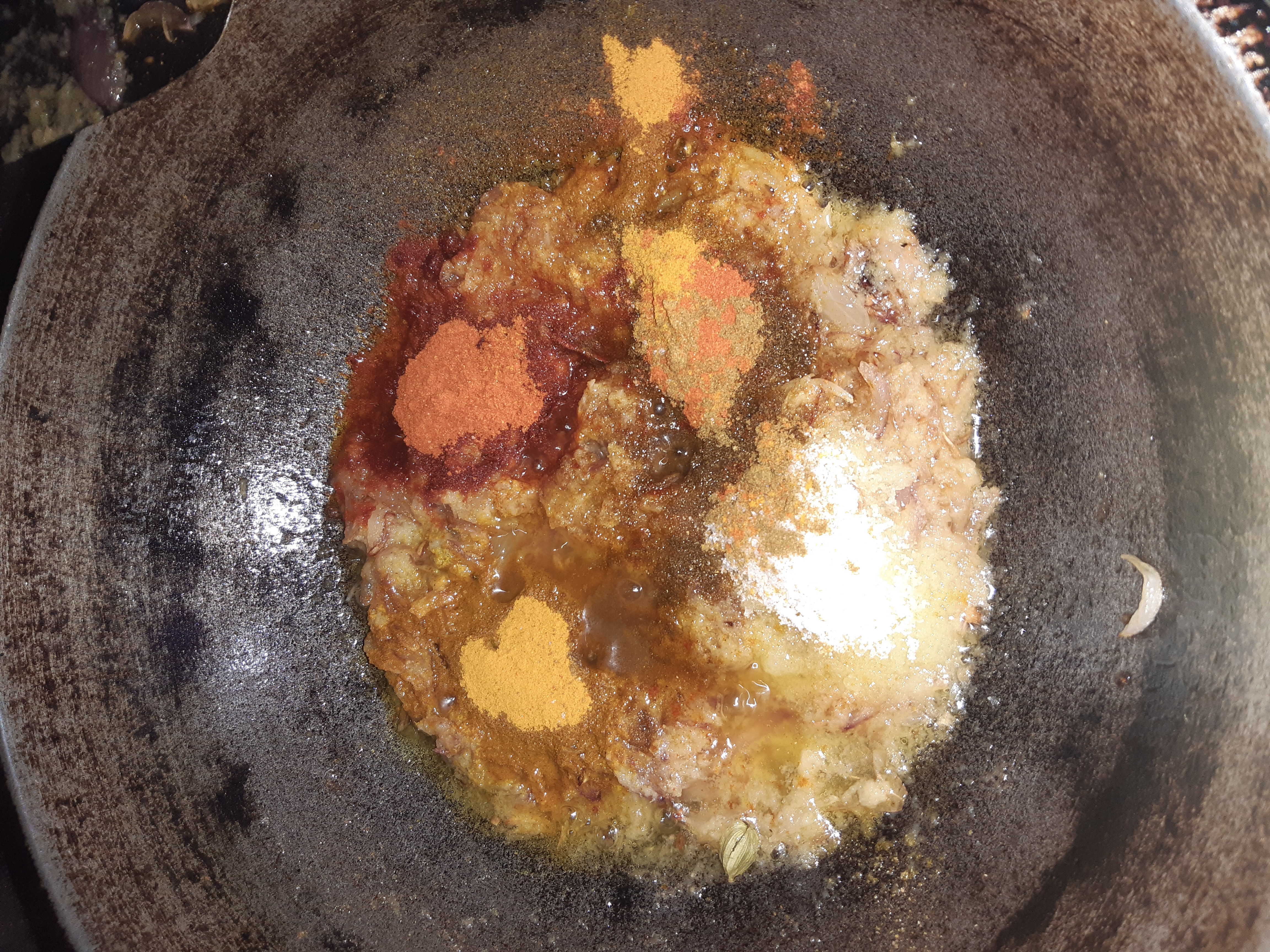 এখন জিরা গুঁড়া এবং গরম মসলা গুঁড়া বাদে সমস্ত রকম বাটা এবং গুঁড়ামসলা কড়াইয়ের ভেতর দিয়ে ভালোভাবে কষিয়ে নিই। এই ধাপটি খুবই গুরুত্বপূর্ণ। কারণ কষানো যতো ভালো হবে তরকারির স্বাদ ততো ভালো হবে।
