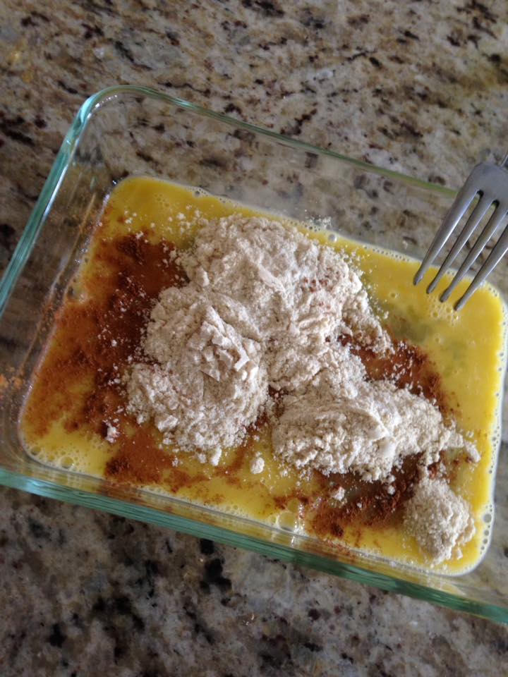 First you are going to whisk an egg. Then, add the milk, cinnamon, and protein powder.