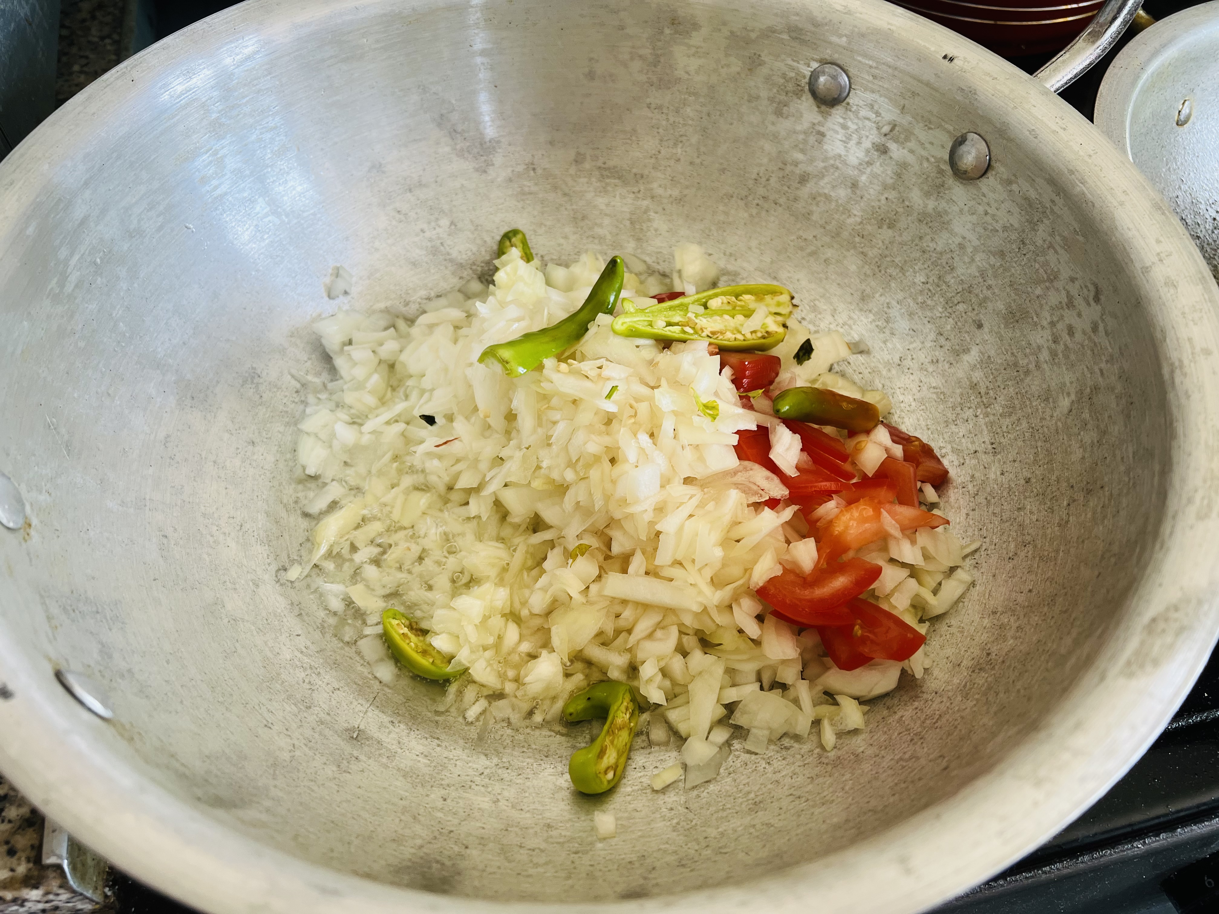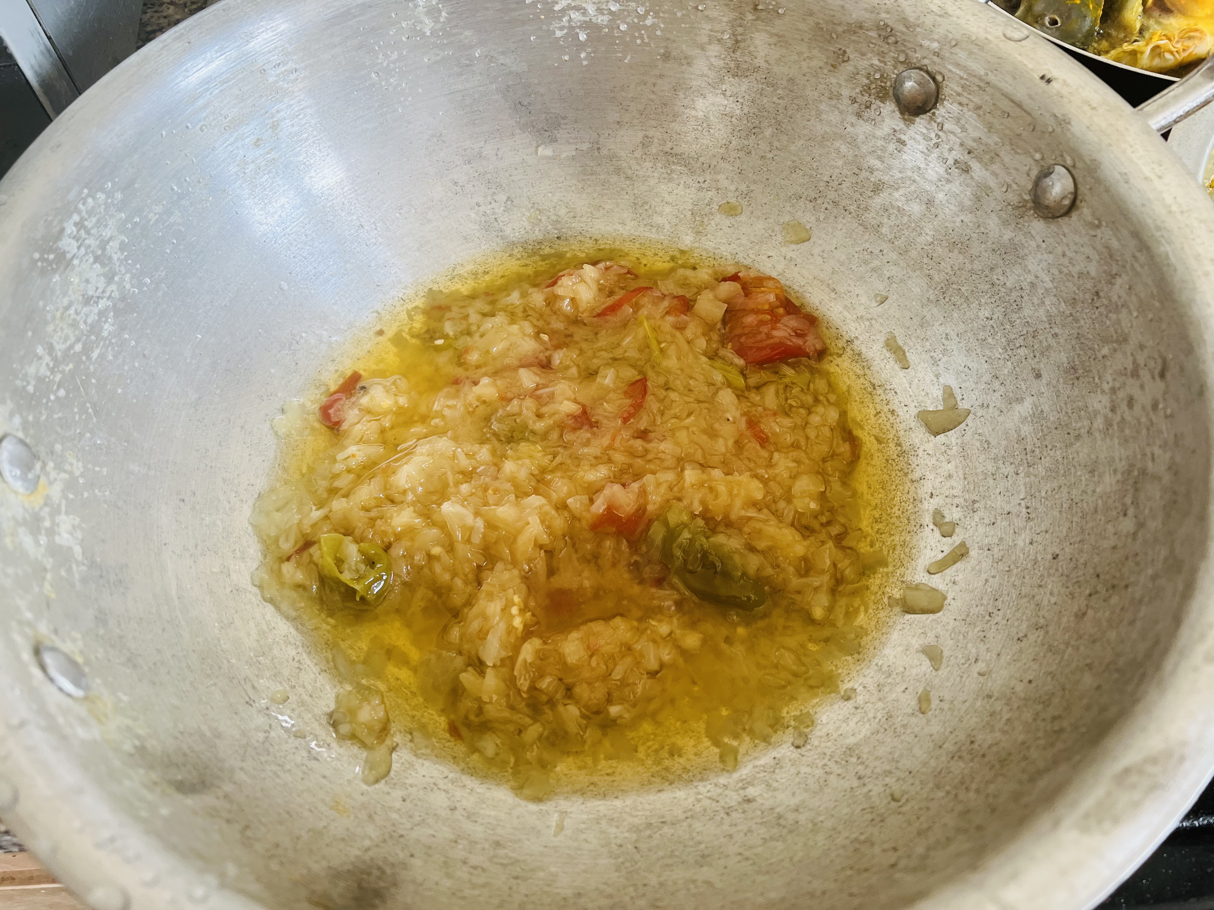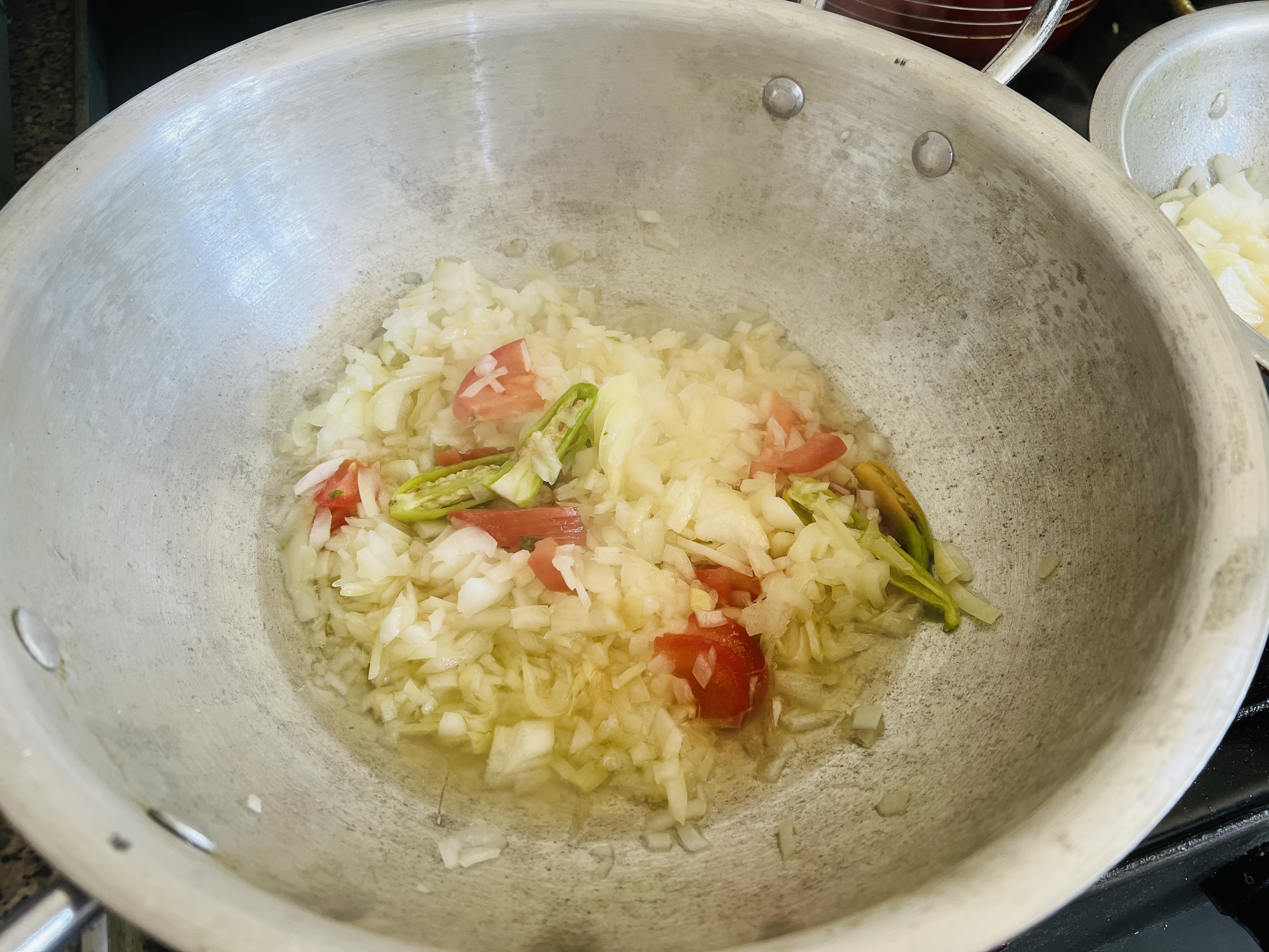 এরপর তেলে পেঁয়াজ, কাঁচামরিচ, টমেটো ও লবণ দিয়ে অল্প আঁচে রেখে দিয়েছি সিদ্ধ হয়ে যাওয়ার জন্য।