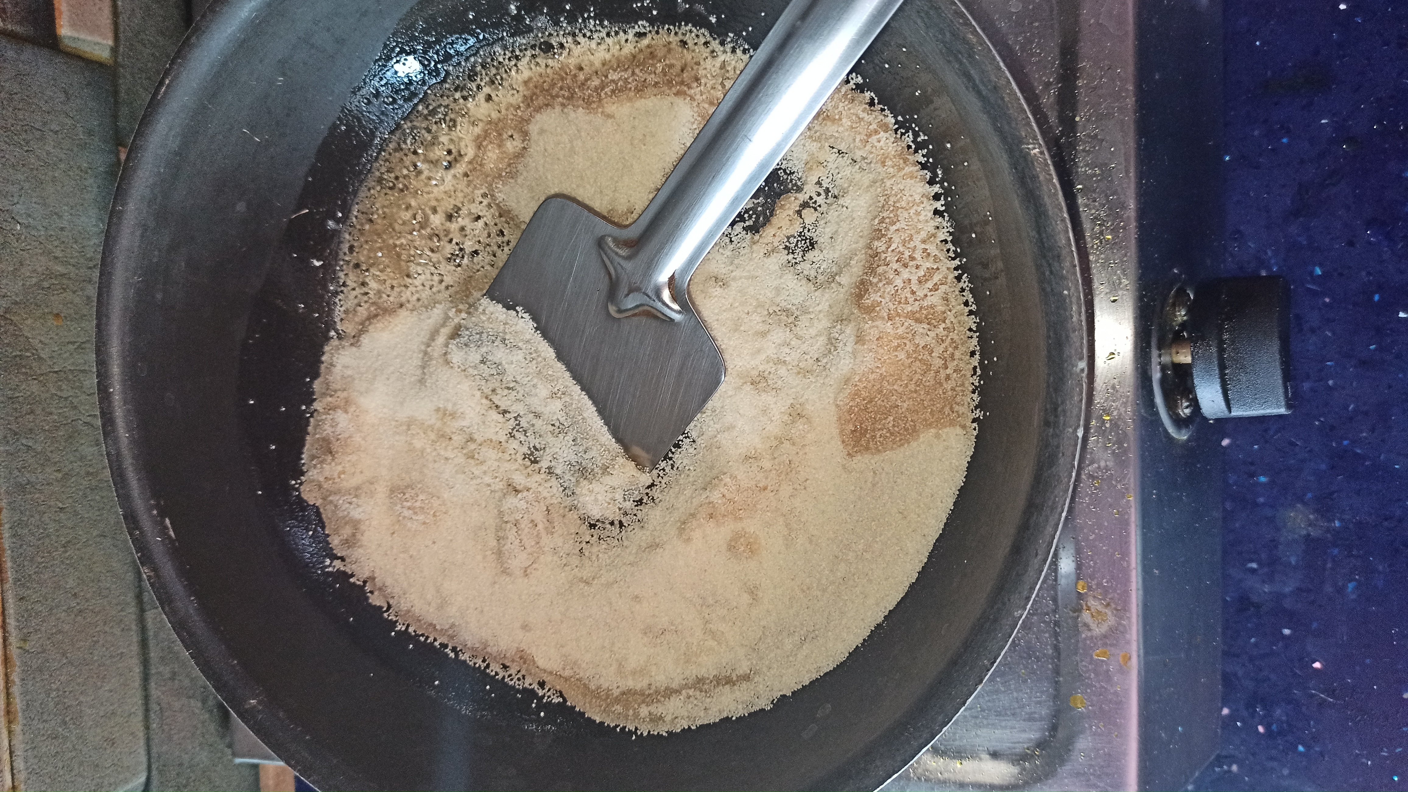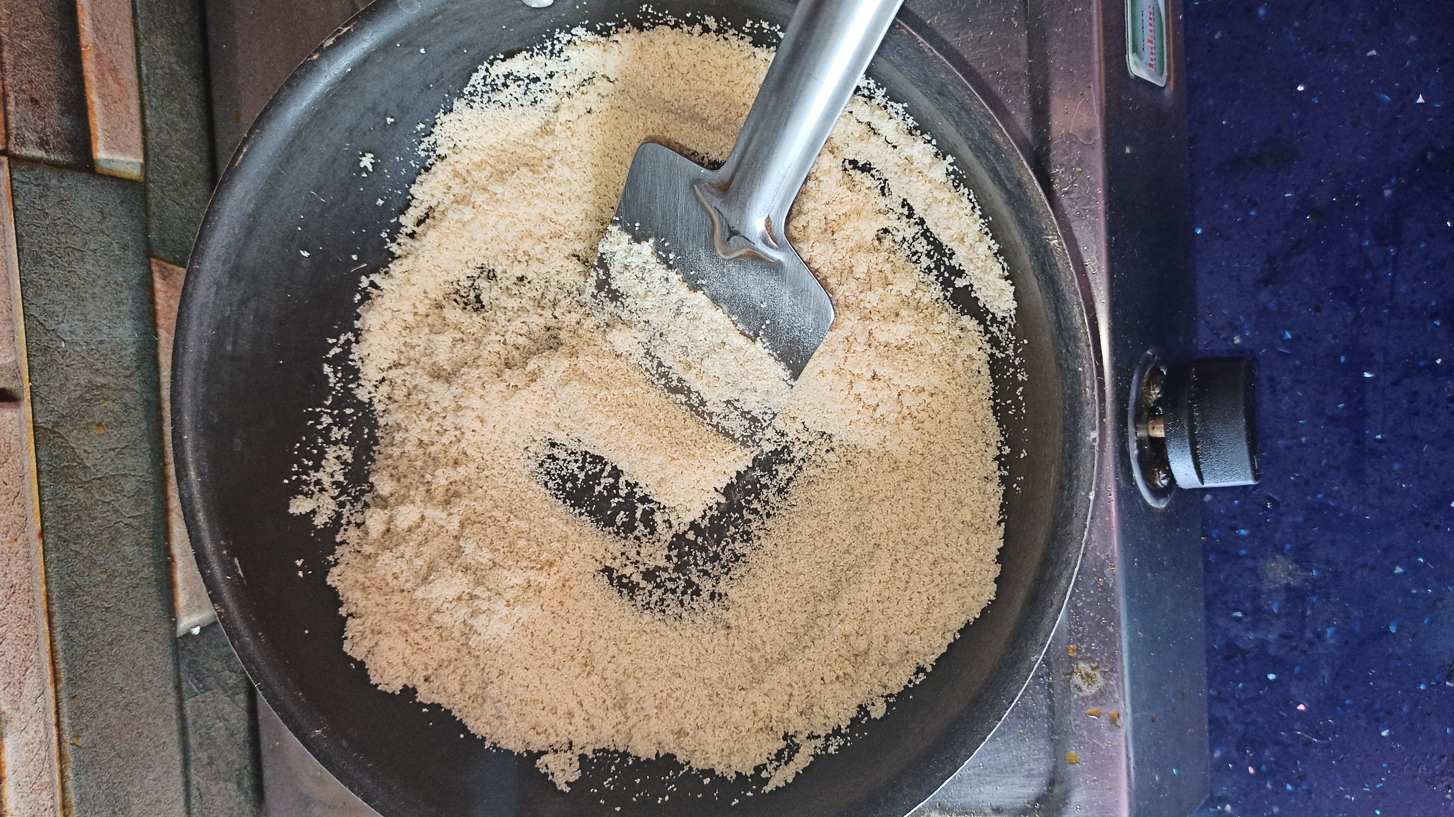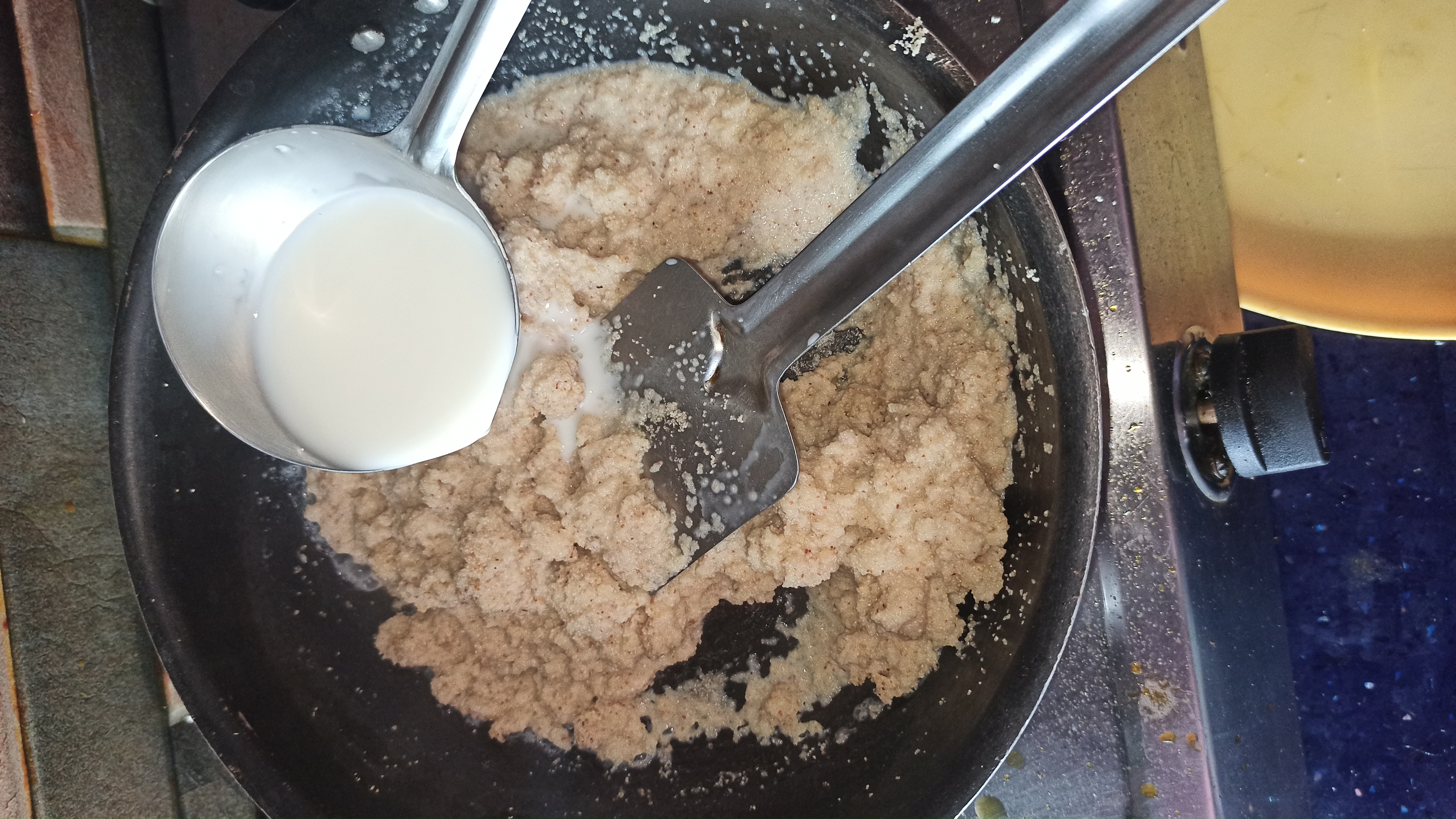 ৩. চুলার উপর একটা কড়াই বসিয়ে দিতে হবে। এবার কড়াইতে এক চামচ ঘি দিয়ে দিতে হবে। ঘি গরম হয়ে এলে ১ কাপ সুজি দিয়ে ভেজে নিতে হবে। সুজি ভাজা হয়ে গেলে ১ কাপ দুধ দিয়ে ভালো করে নেড়ে চেড়ে দুধের সাথে মিশিয়ে দিতে হবে।