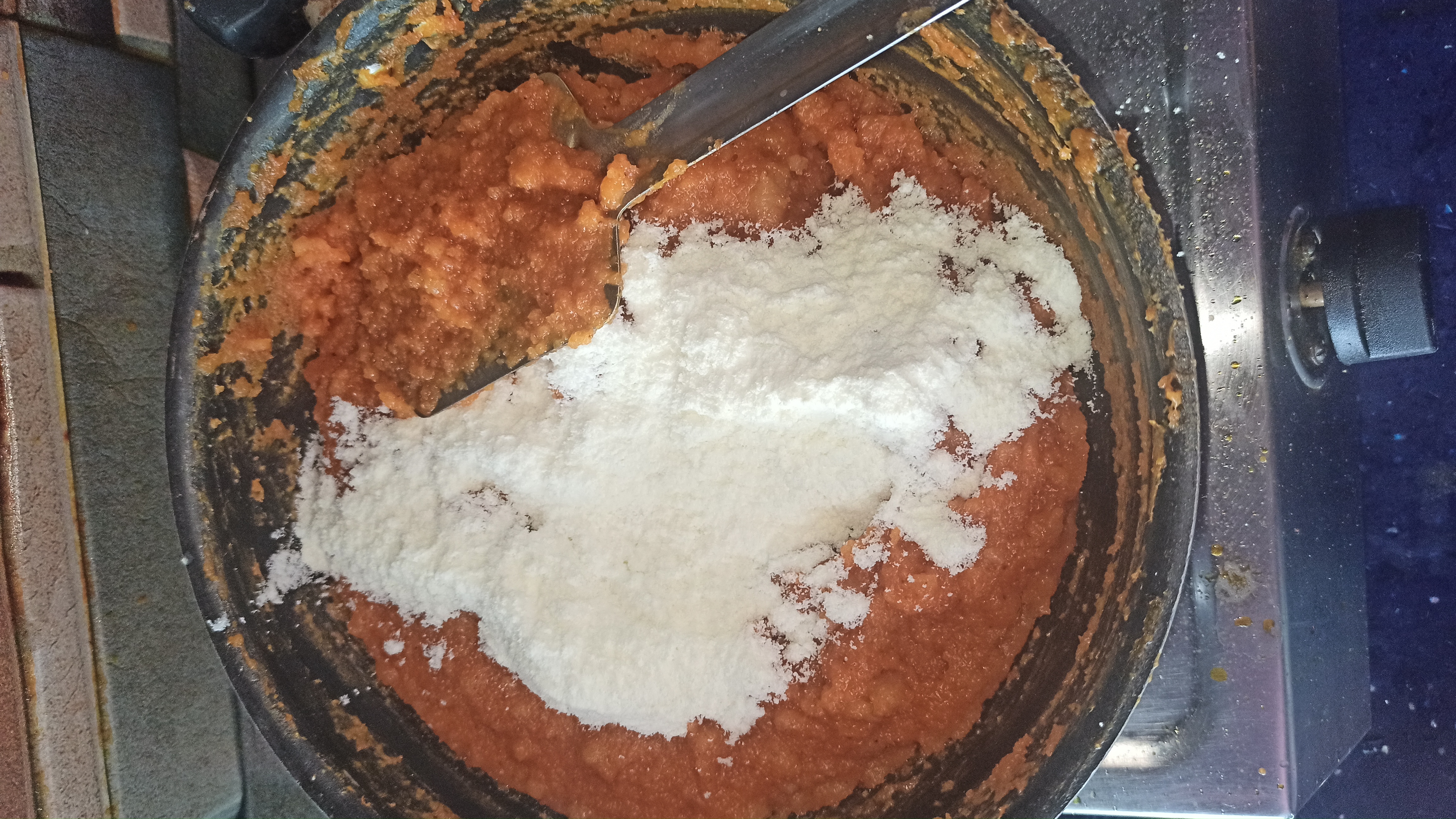 ৪. এবার পুরো দুধের সাথে মিশিয়ে নেওয়া হয়ে গেলে আবারও দুই কাপ দুধ দিয়ে আবার রান্না করে নিতে হবে। চুলার আঁচ কমিয়ে দিয়ে রান্না করতে হবে। সুজি যখন শুকিয়ে যাবে তখন আমের পাল্প দিয়ে দিতে হবে।এবার একে একে ২ কাপ চিনি , এক চিমটি লবণ ও এক কাপ গুড়ো দুধ দিয়ে আবারও রান্না করতে হবে। চিনি দেওয়ার পর সুজি অনেকটা নরম হয়ে যাবে। সুজি নাড়তে থাকতে হবে কিছু সময় পর সুজি একটু শক্ত হয়ে আসলে ২ চামচ ঘি দিয়ে দিতে হবে। এবার আবার নাড়তে থাকতে হবে। কড়াই থেকে থেকে যখন সুজি ছেড়ে দেবে এবং অনেকটা শক্ত হয়ে যাবে তখন একটা পাত্রে নামিয়ে নিতে হবে।