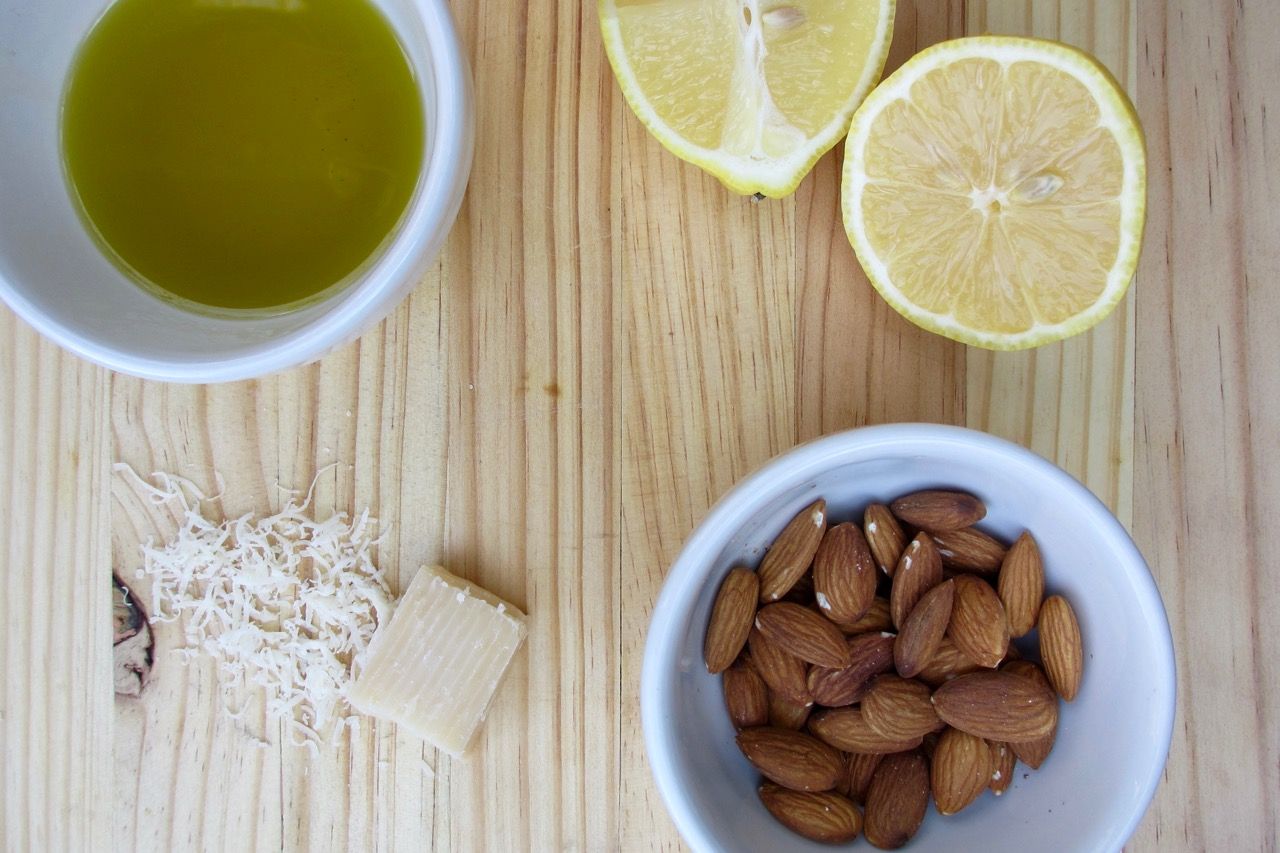Having a basic, reliable pesto recipe is definitely a must-have. This recipe plays a twist on the classic sauce by using almonds instead of pine nuts, and substituting a portion of the basil leaves with baby spinach. The reason for this substitution was not for any reason other than the fact that the basil plants I had growing outside just did not have enough leaves to make a good batch of pesto. I opened the fridge and found a nice bag of baby spinach, and made a plan from there. The end result was a milder than normal, but still delicious, pesto. One thing that I hope to inspire all of you to do in the kitchen is to improvise where you can with ingredients that you have, are in season, and are more nutritious than the norm!