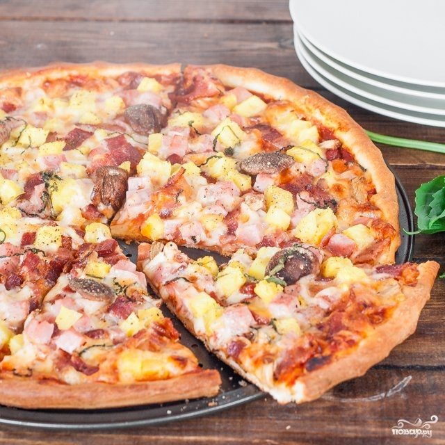 Send pizza bake for 10-15 minutes in a well-heated oven (up to 220-250 C). The finished pizza with Hawaiian pineapple can serve with additional cheese, herbs and olive oil. Bon Appetit!