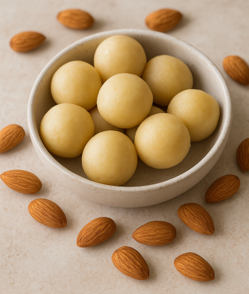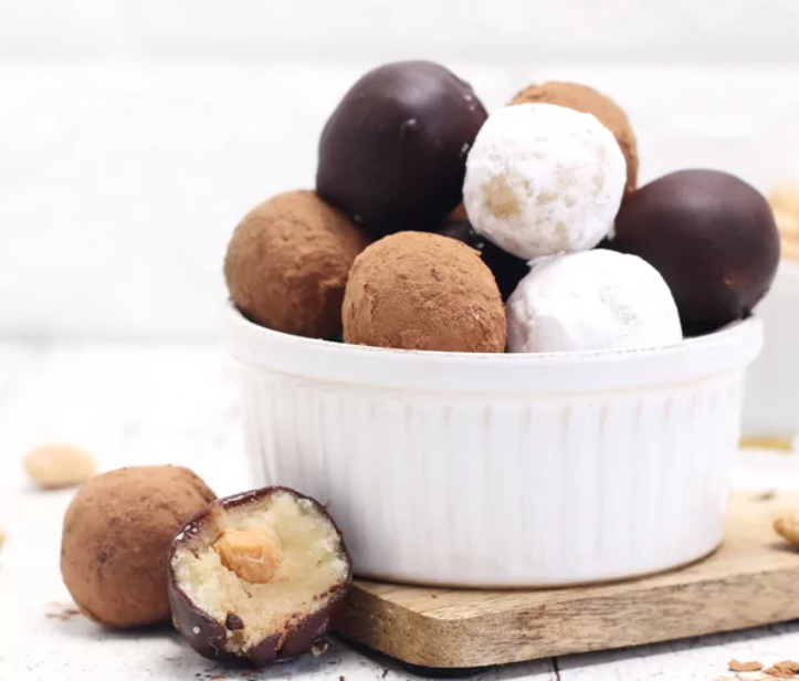 Marzipan is rolled into balls and then dipped in melted dark or white chocolate.