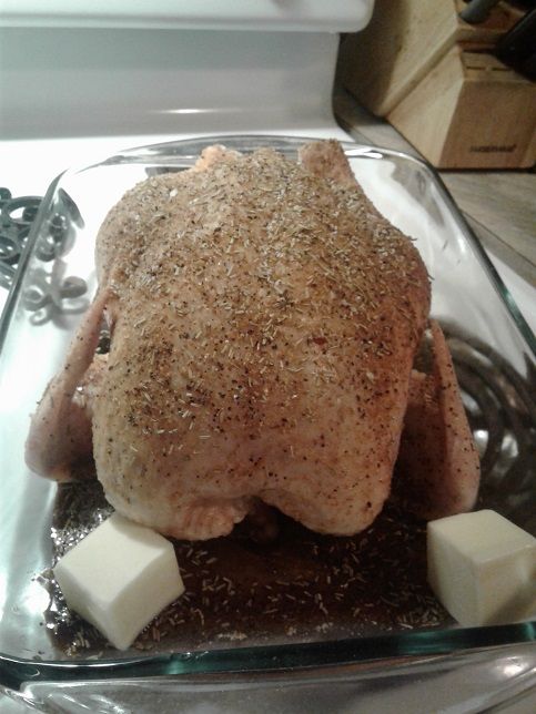 Add all the seasonings and spread them evenly on the chicken. Put one stick of butter inside the chicken and cut up the other and put it in the pan.