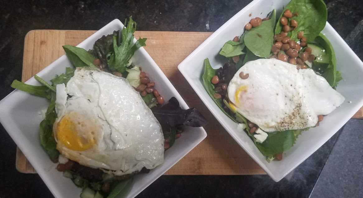 My favorite way to eat breakfast is to enjoy an egg on a pile of yummy, healthy stuff. This egg and lentil bowl is just that. Buried underneath the hard fried egg: crisp cucumber, savory lentils, and a mountain of greens. I also toss in a few crumbles of feta cheese, but I can’t resist. We have a saying around here: “feta makes everything bett-a,” for it’s ability to make a dish really pop by adding it’s unique flavor to the mix.