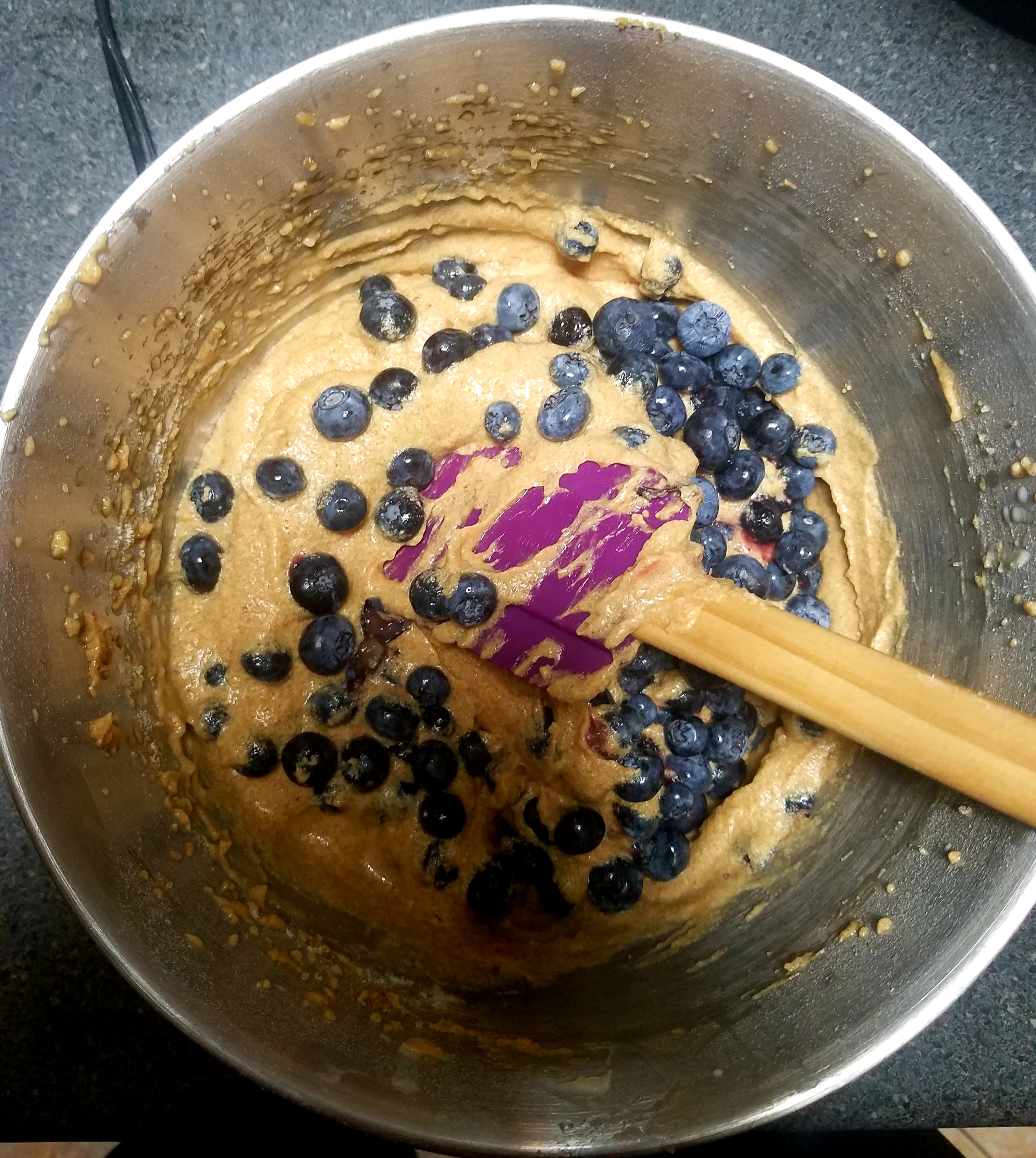 4.Gently fold blueberries into batter. Pour batter into prepared muffin tin.