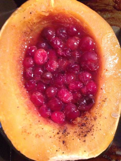 Add 1/3 c fresh organic GMO free cranberries into each half. Sprinkle 2 tsp lemon juice in each half.