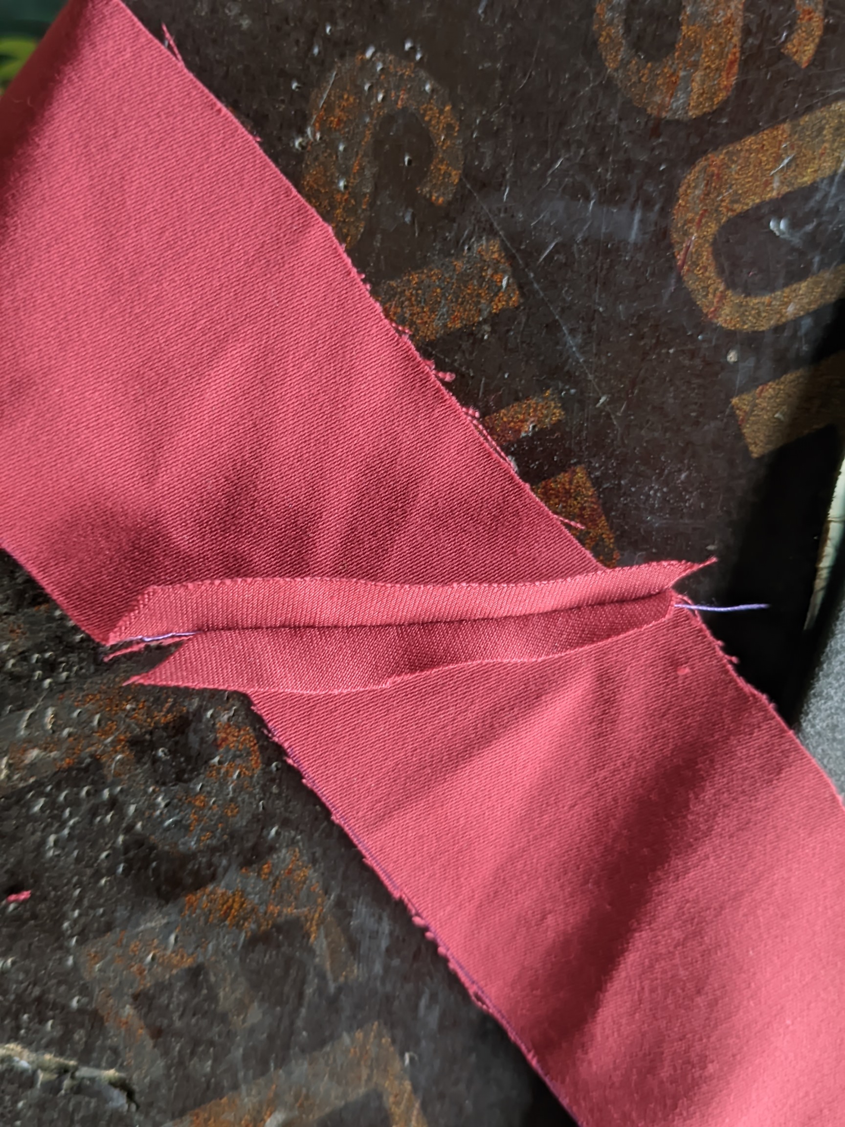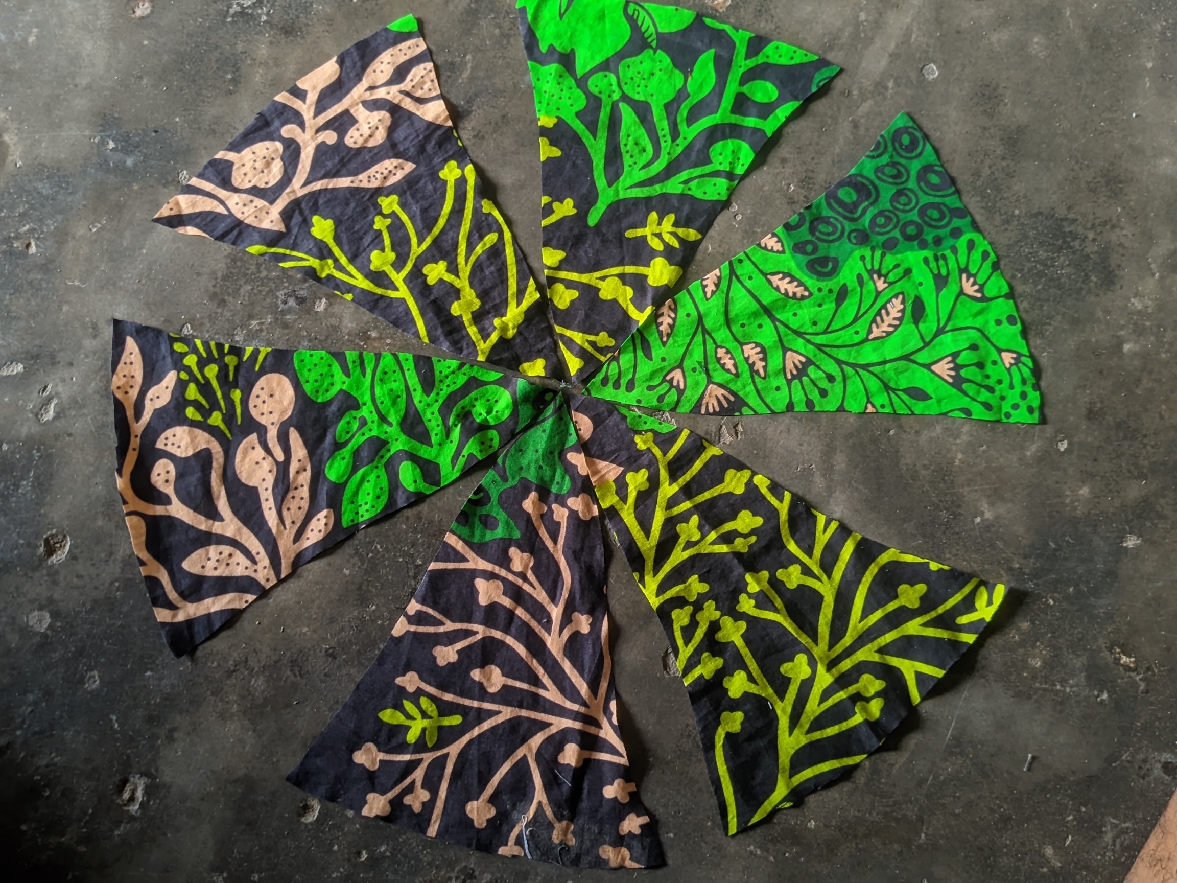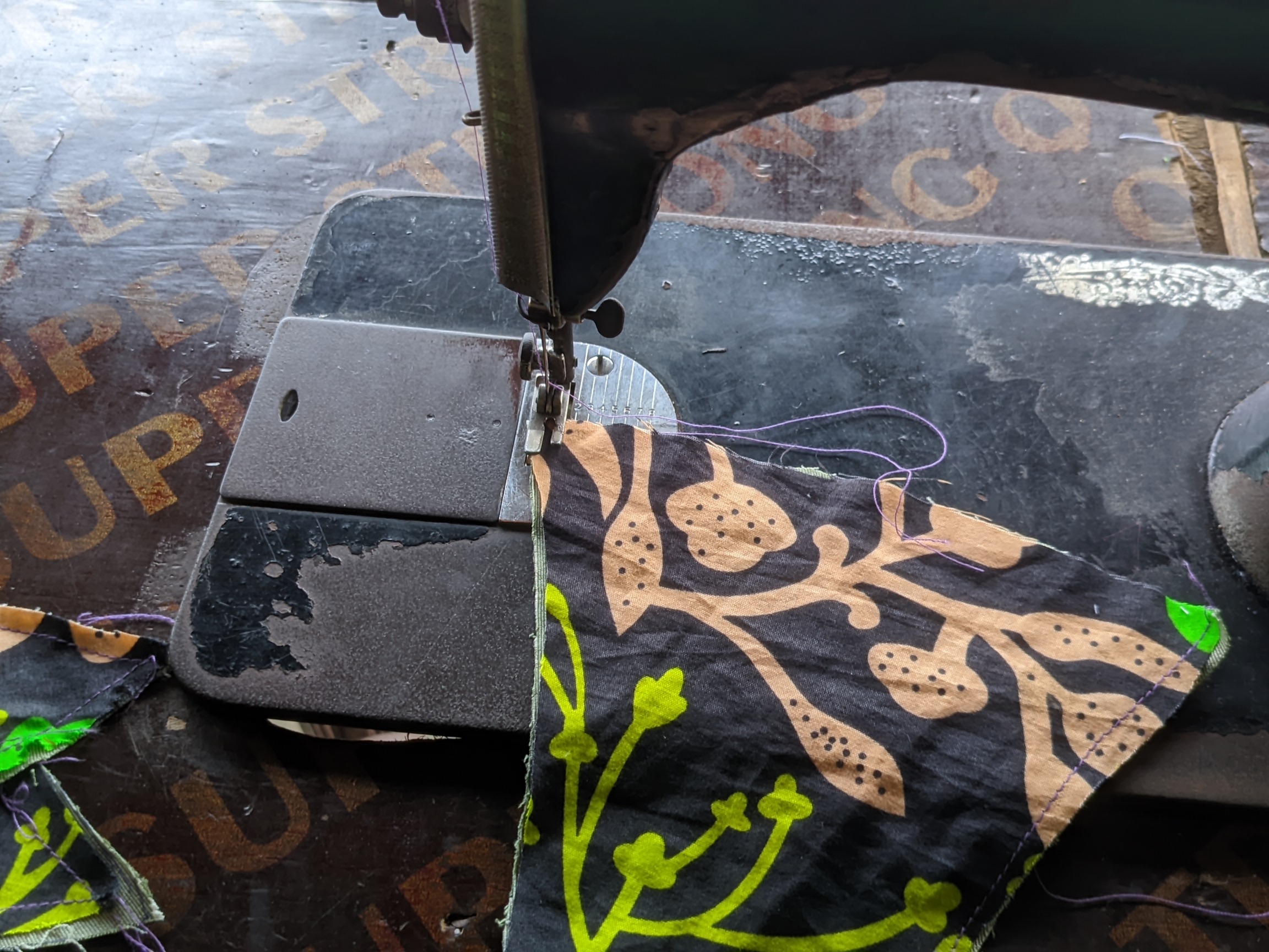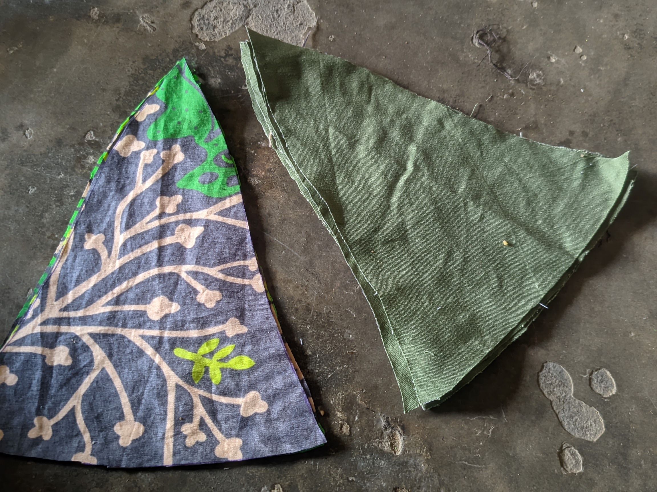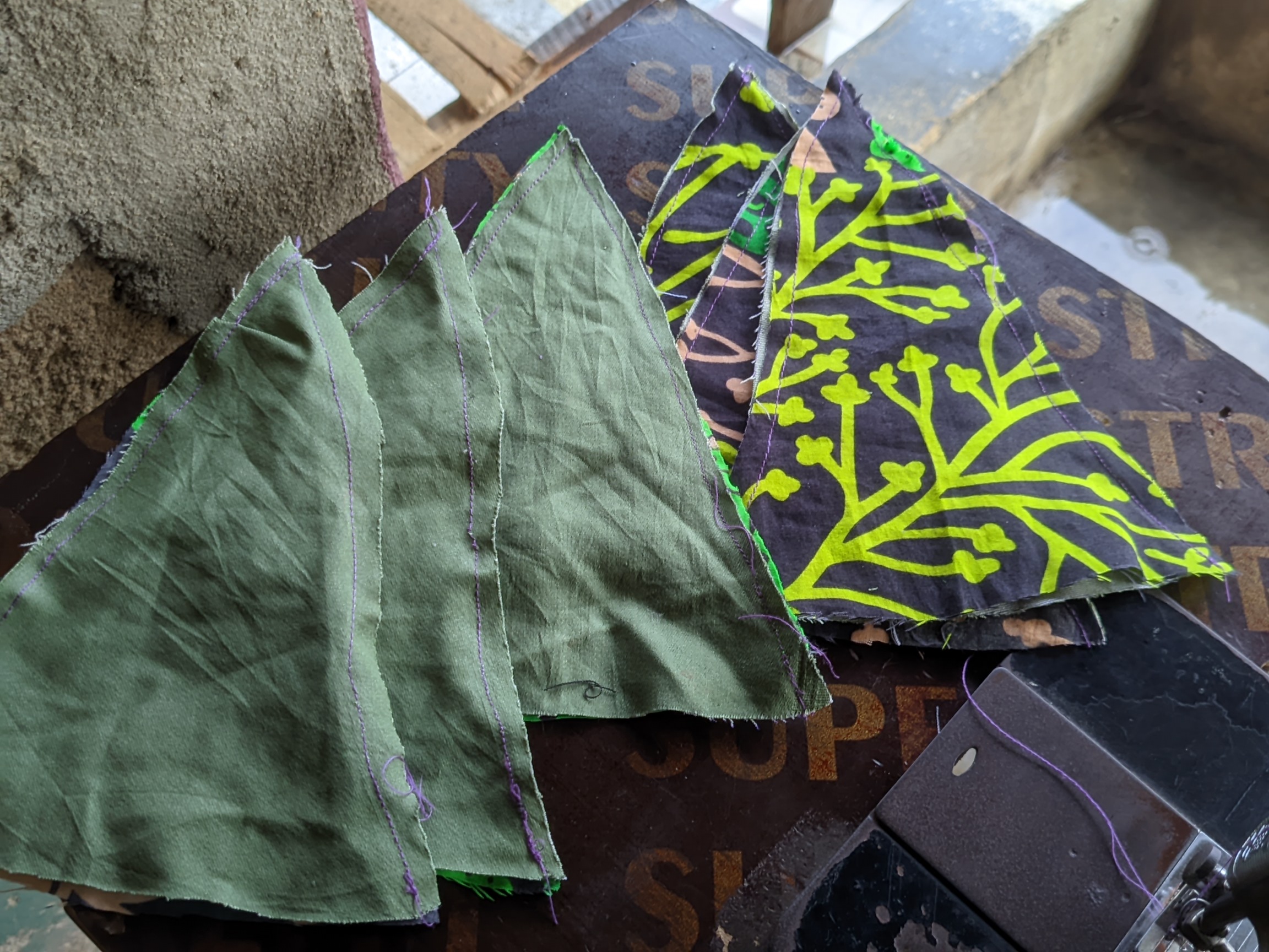 • I carved out 6 pieces in each of the materials. After arranging them together, I then used my dad's sewing machine to join them together. I was extra careful about how I sewed it because of the nature of the material. The chinos' material likes extending because it's not elastic in nature.