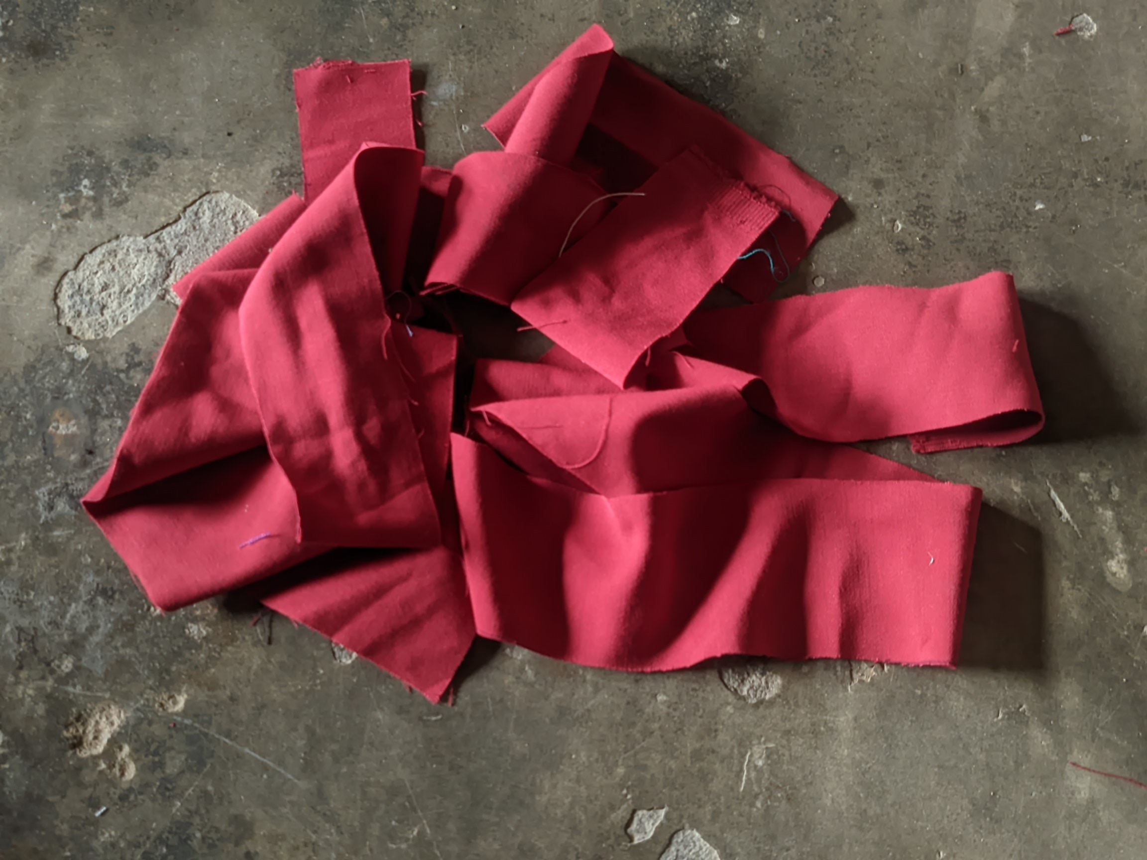 • After drawing the curve with the broomstick, I used a scissor to cut out the parts that won't be useful, and it gave me a mountain-like shape, as you can see. I used this shape and placed it on the materials I brought from the trash can and drew the shape with a pen, corresponding to the shape placed on the material. I first did the cravings on a chino material before using a cotton material, which would serve as the inner.