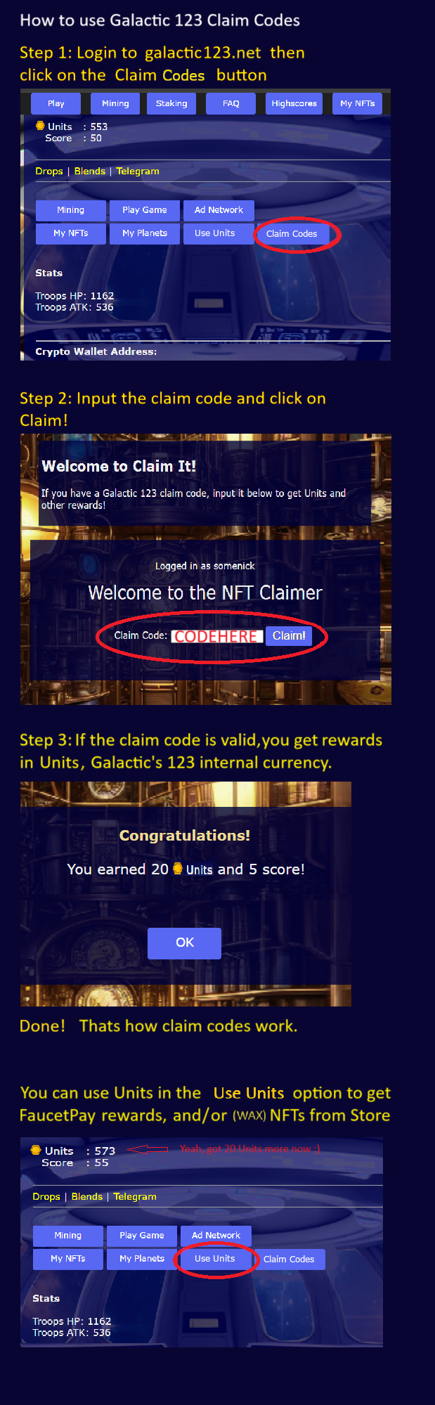 - To apply the Claim Code, login to Galactic 123 and, after login, input the claim code in the Claim Codes button. Here is a visual guide: