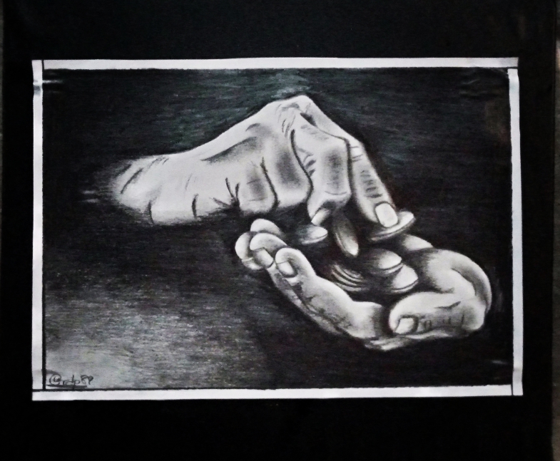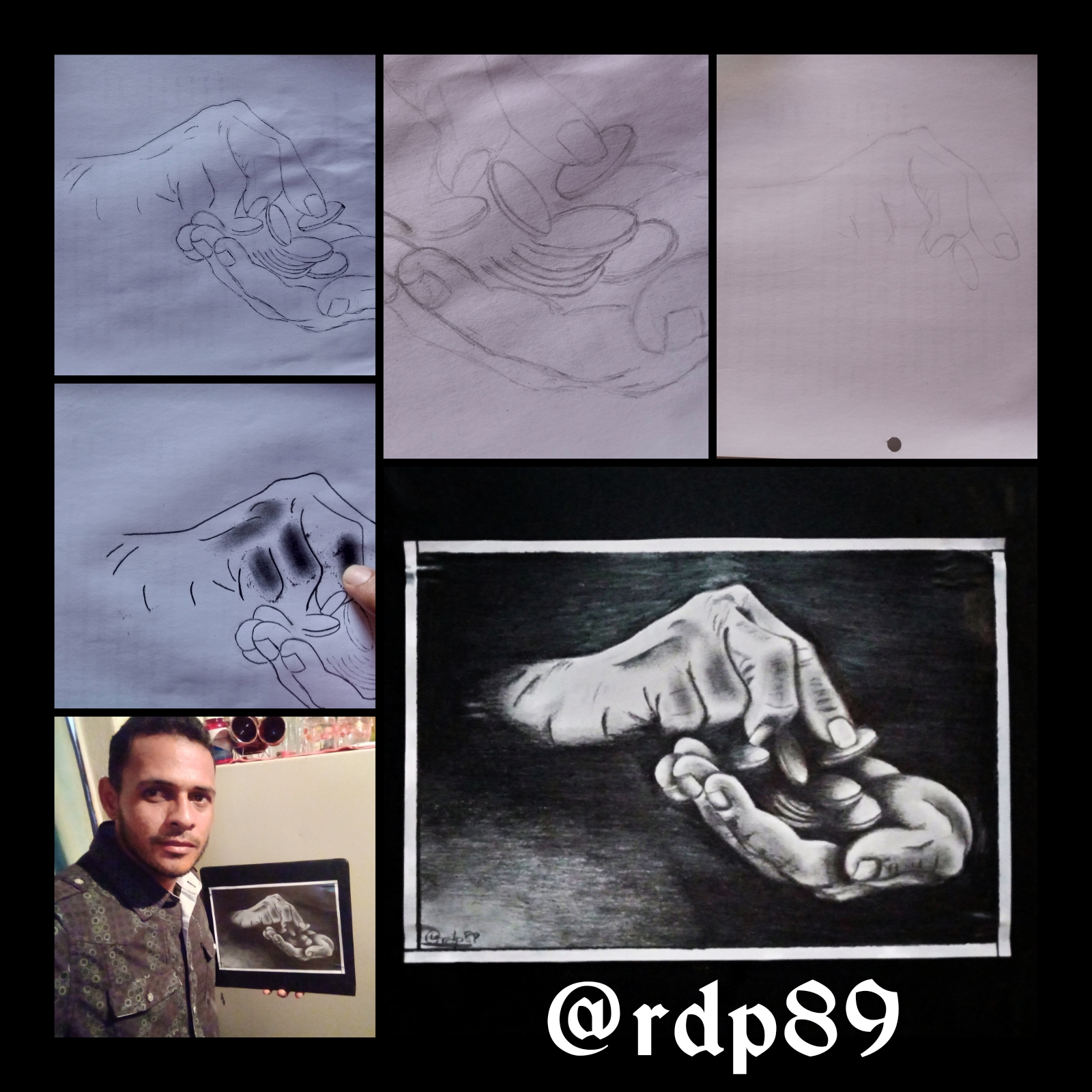 *Saludos amigos, hoy elaboré un dibujo con la técnica del claro /oscuro, y difuminación, representando una arte en blanco y negro. La mano de arriba suelta varias monedas recibiendo la de abajo, como si estuviera contando sus ahorros o como administrar su Finanzas.