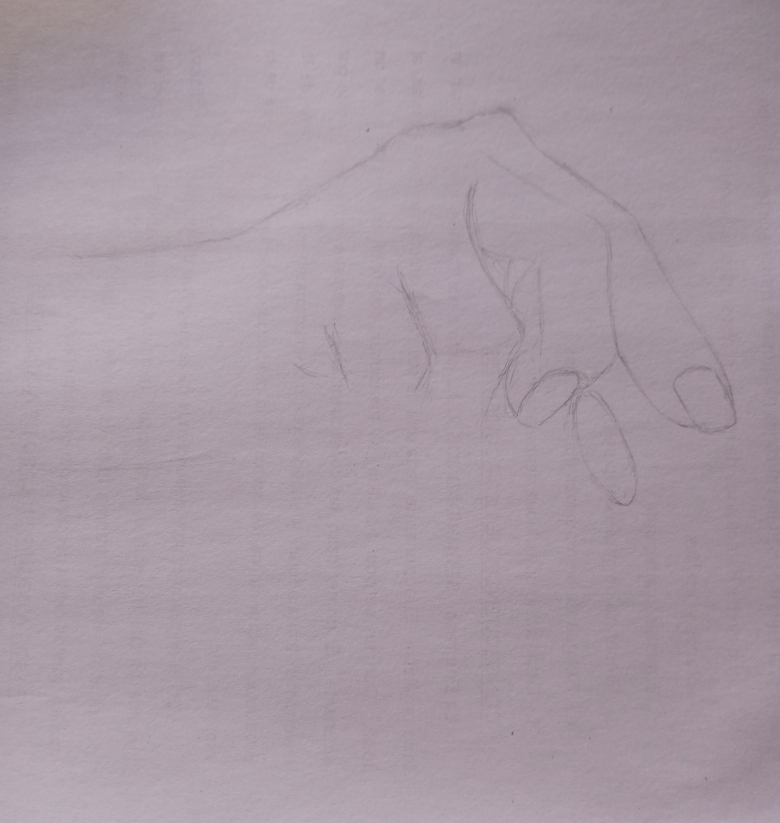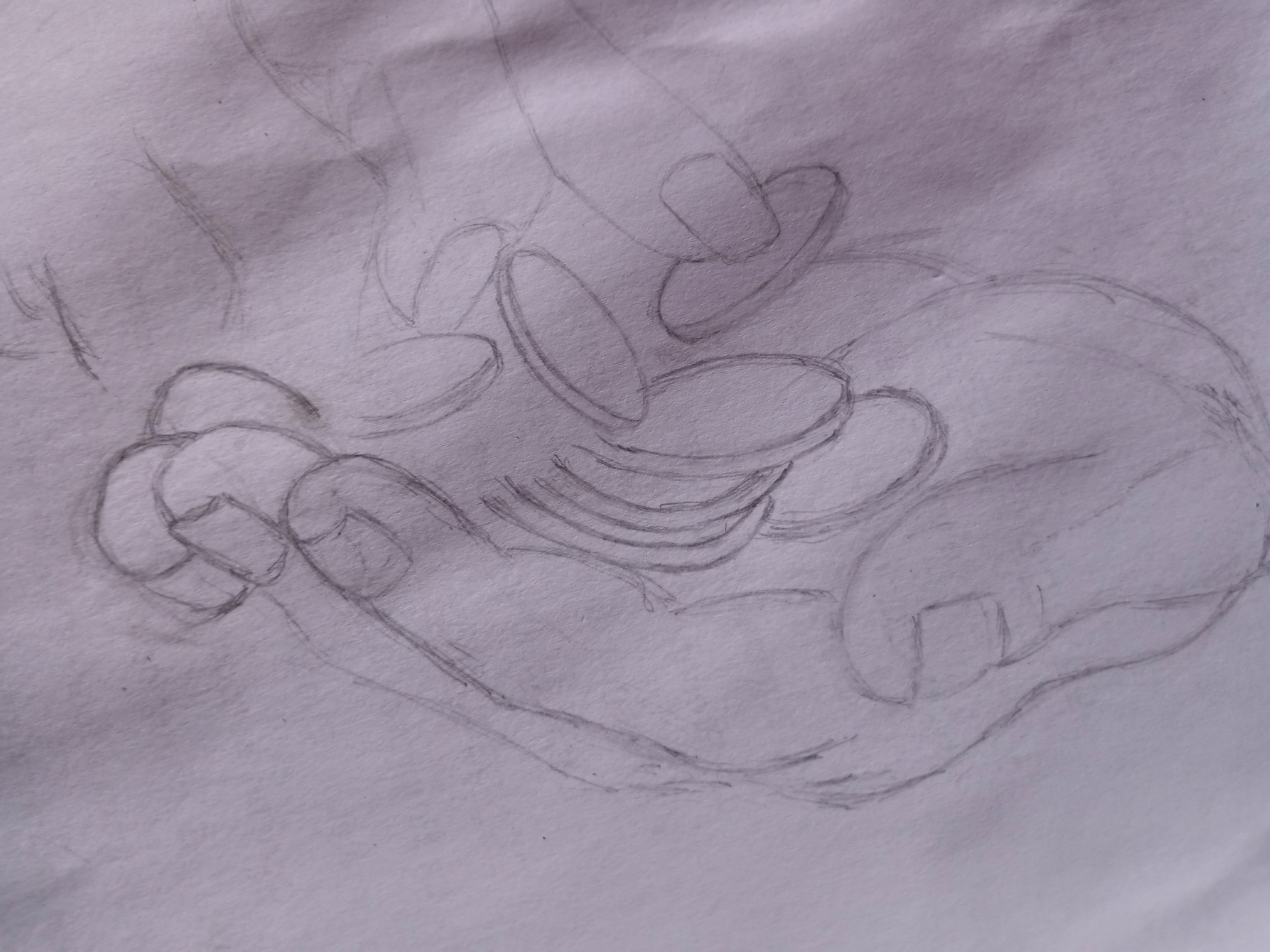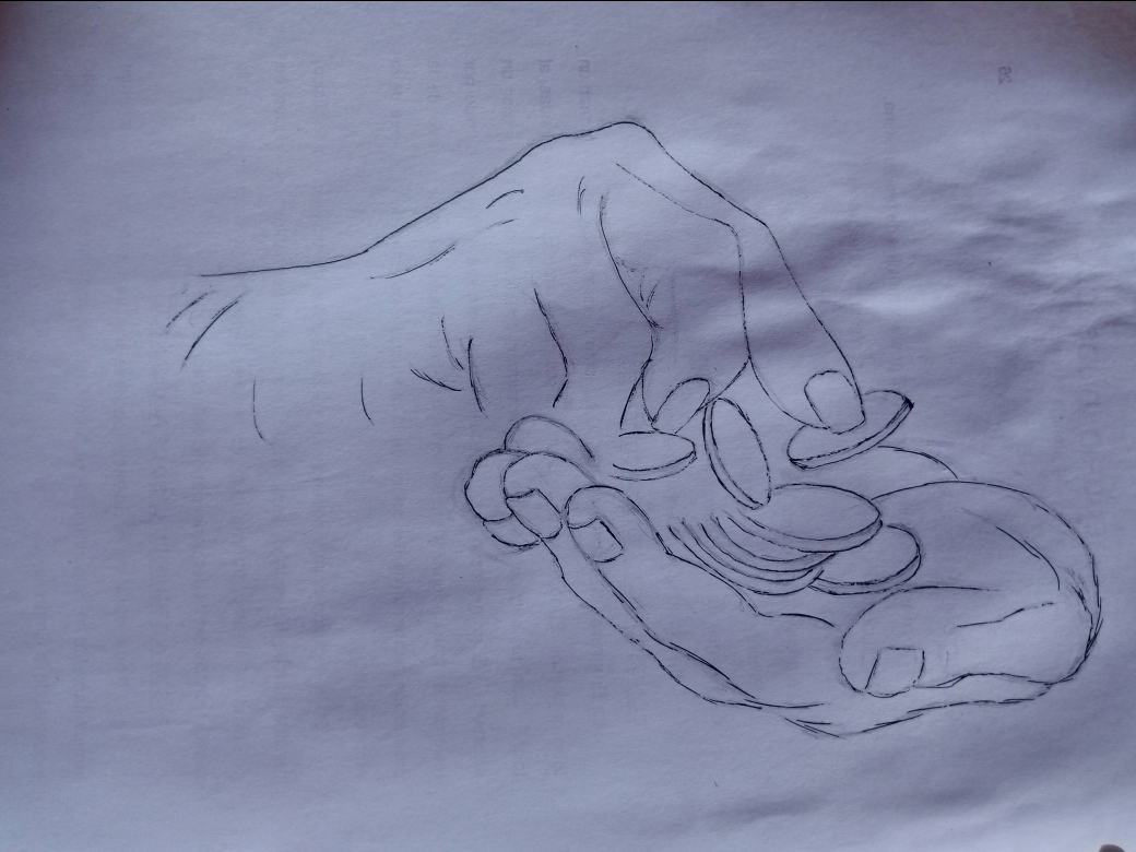 Paso 1: Para comenzar mi dibujo comienzo primeramente haciendo la mano superior, dándo la forma de los dedos y anexando también una primera moneda de varías, este paso es mi boceto con el cuál puedo ir corrigiendo mi dibujo.