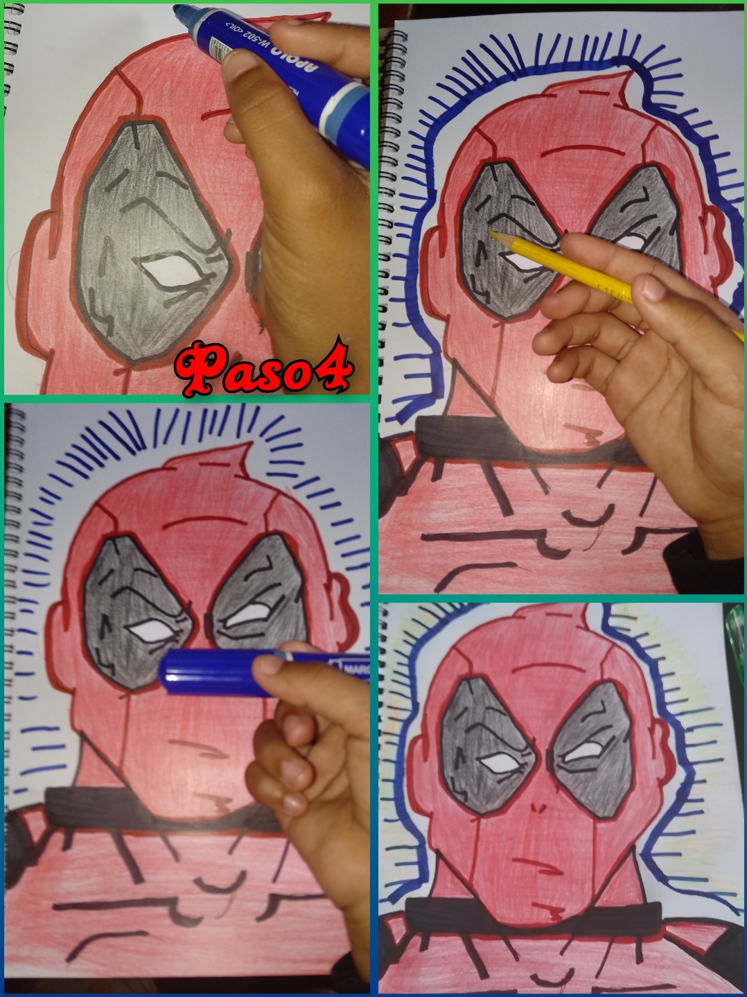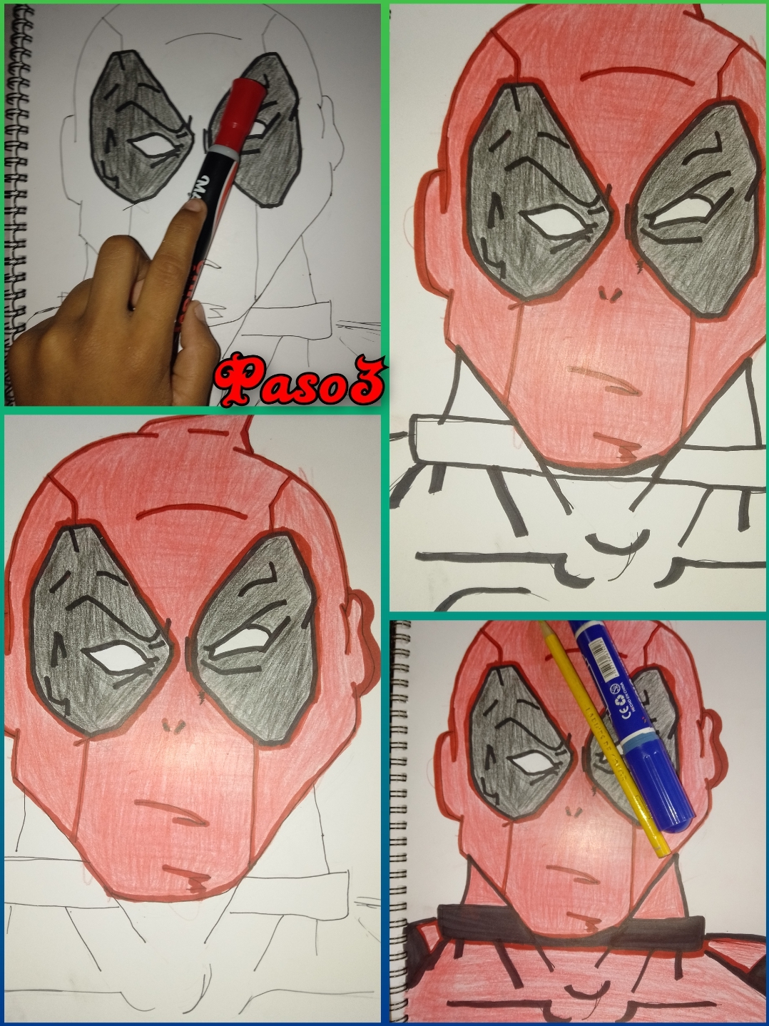 Con el marcador rojo delinearé todo el borde del rostro y después con un color rojo rellenaré todo mi rostro veo que mi dibujo me está quedando muy bonito y saben que justo así es el verdadero deadpool 😁.