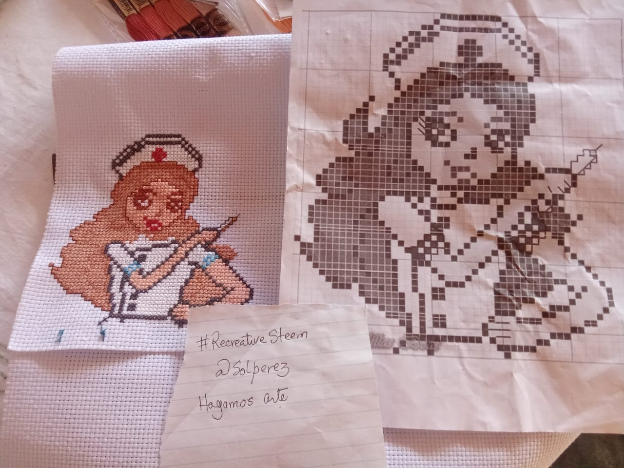 Como quizás muchos han de saber, el 12 de mayo es el día de la enfermera y deseo regalarle a mi hermana una toalla con una enfermera y su nombre. Pero hasta el día de hoy, solo he podido bordad a la enfermera y aún no he iniciado el nombre. Por fortuna, todavía tengo tiempo para hacerlo.