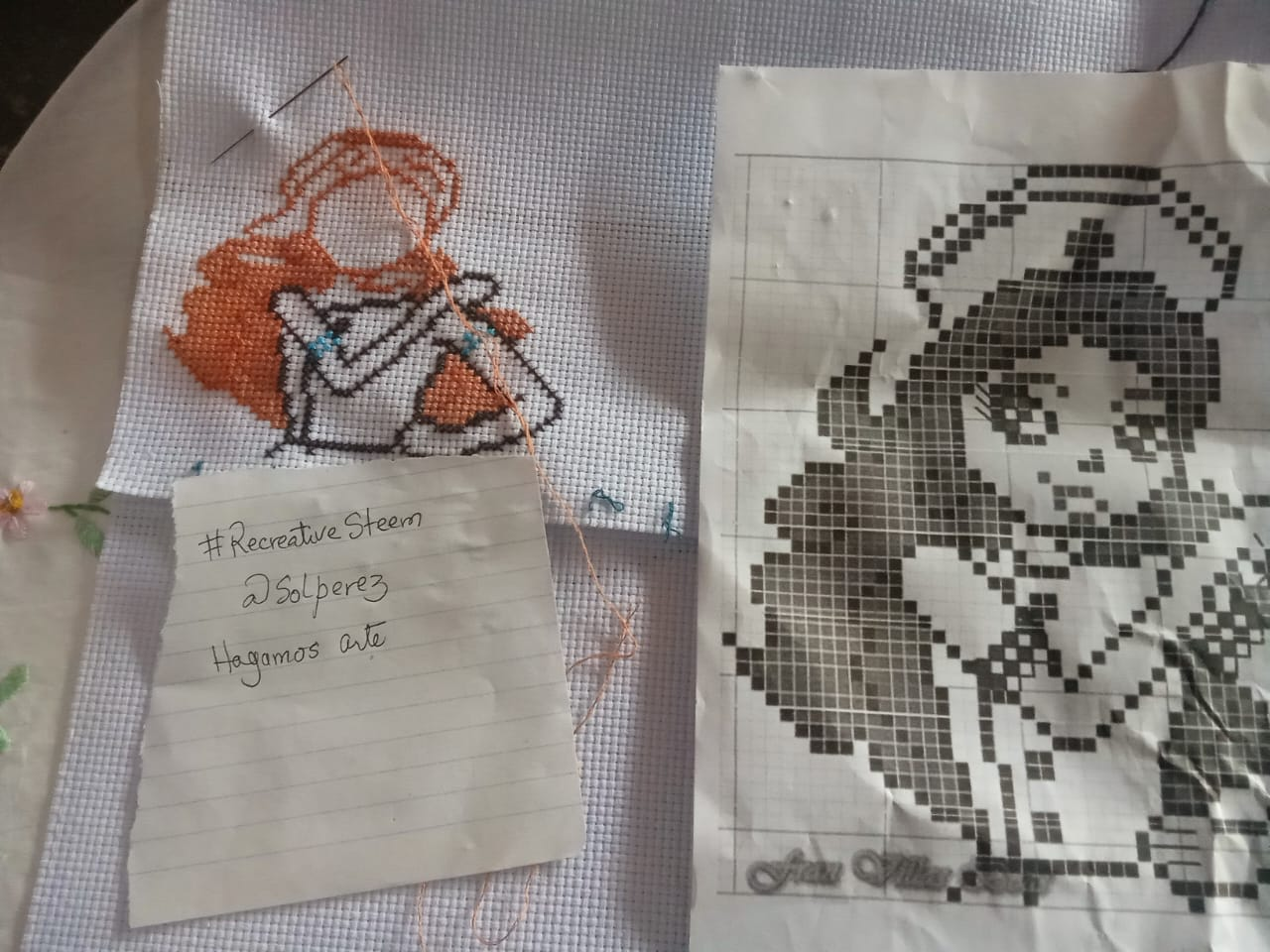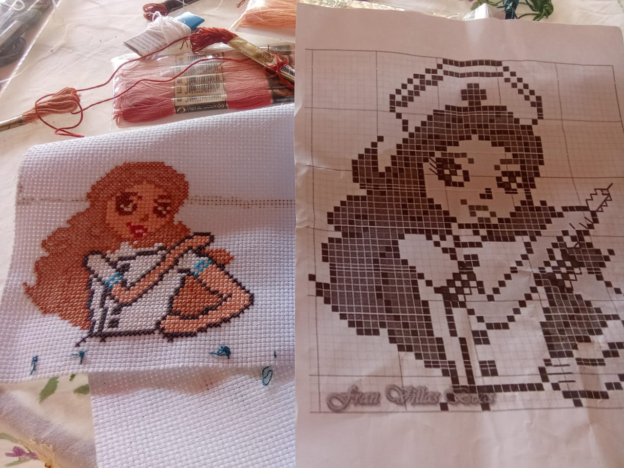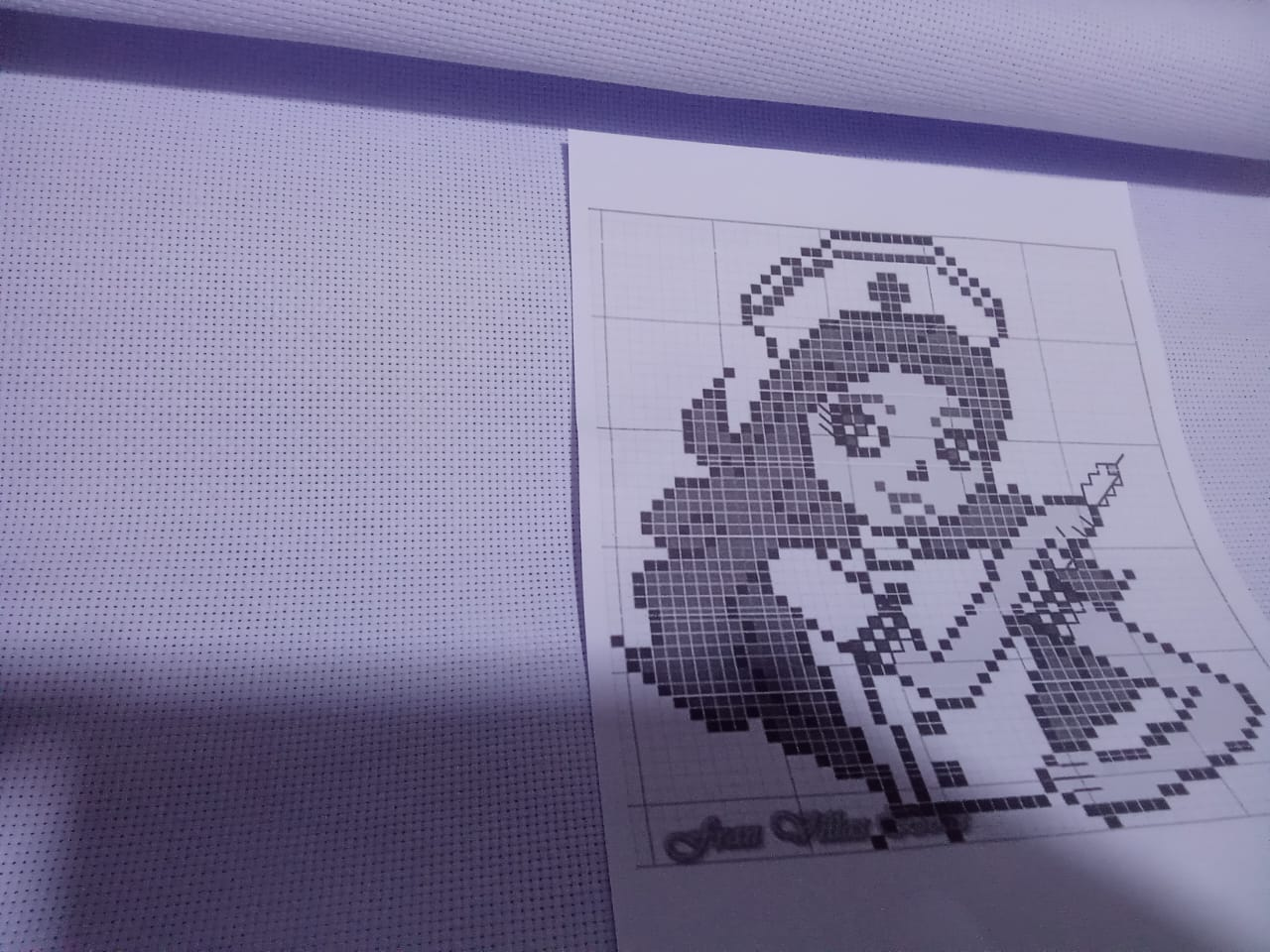 Bueno, lo primero que se debe hacer para realizar un bordado en punto de cruz es "contar los cuadritos de la tela" para que cuando vayamos a bordar la figura se nos haga más fácil. Acá está mi tela en blanco y el diagrama al lado.