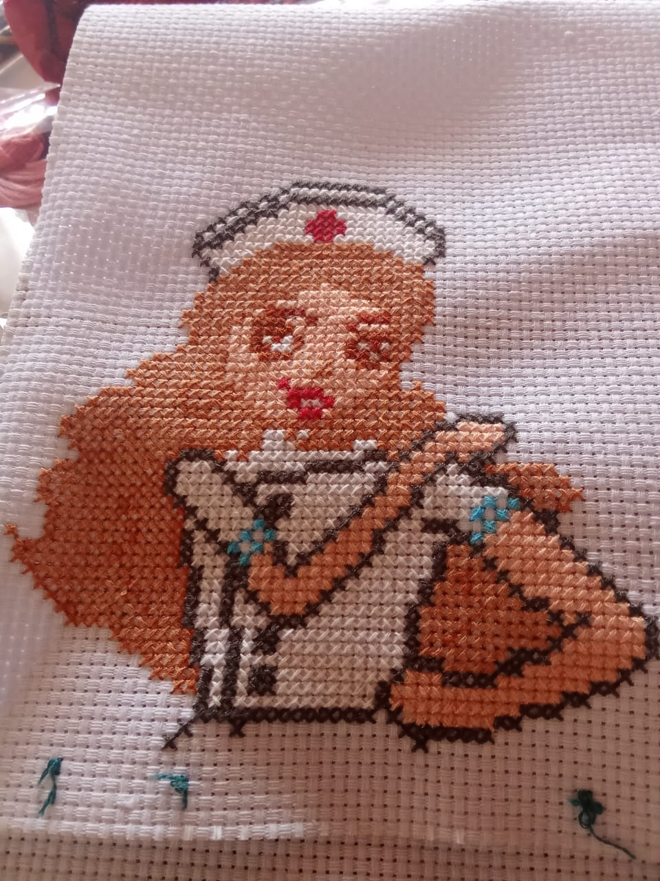 Los rostros son la parte más delicada, ya que cualquier error nos puede echar a perder el trabajo; y con el bordado en punto de cruz es difícil desbaratar, pues podemos romper el entramado de la tela. Así que una vez terminado el cabello de la enfermera, me enfoqué en la cara y rellené el uniforme: