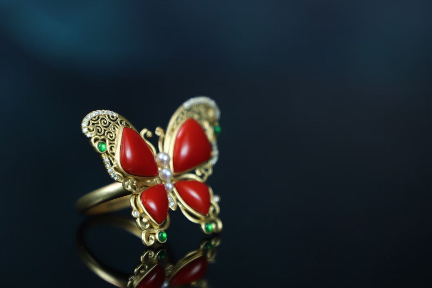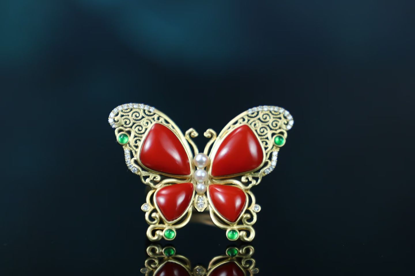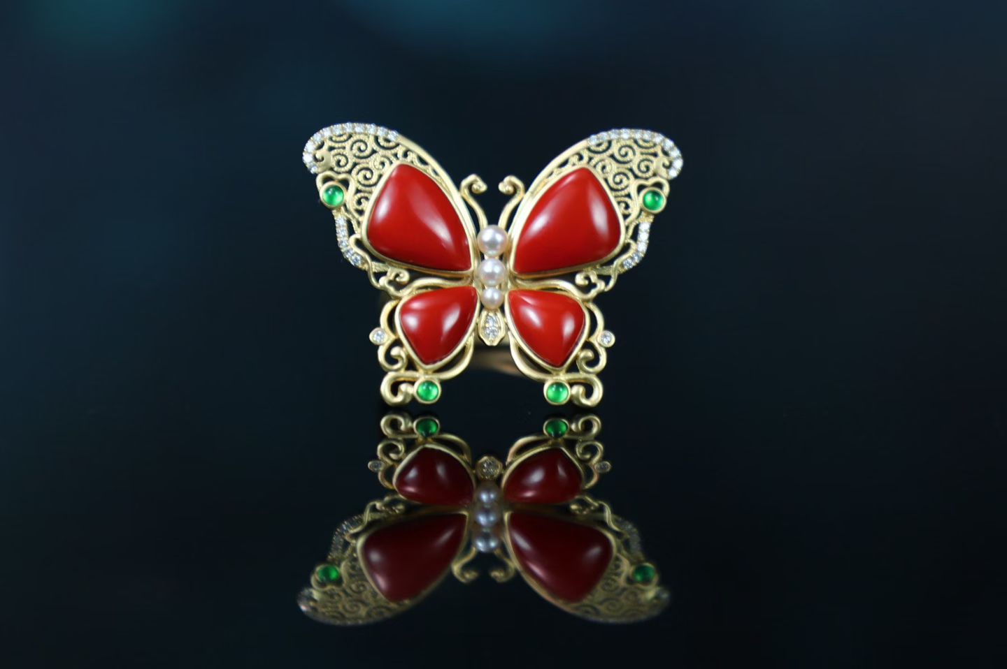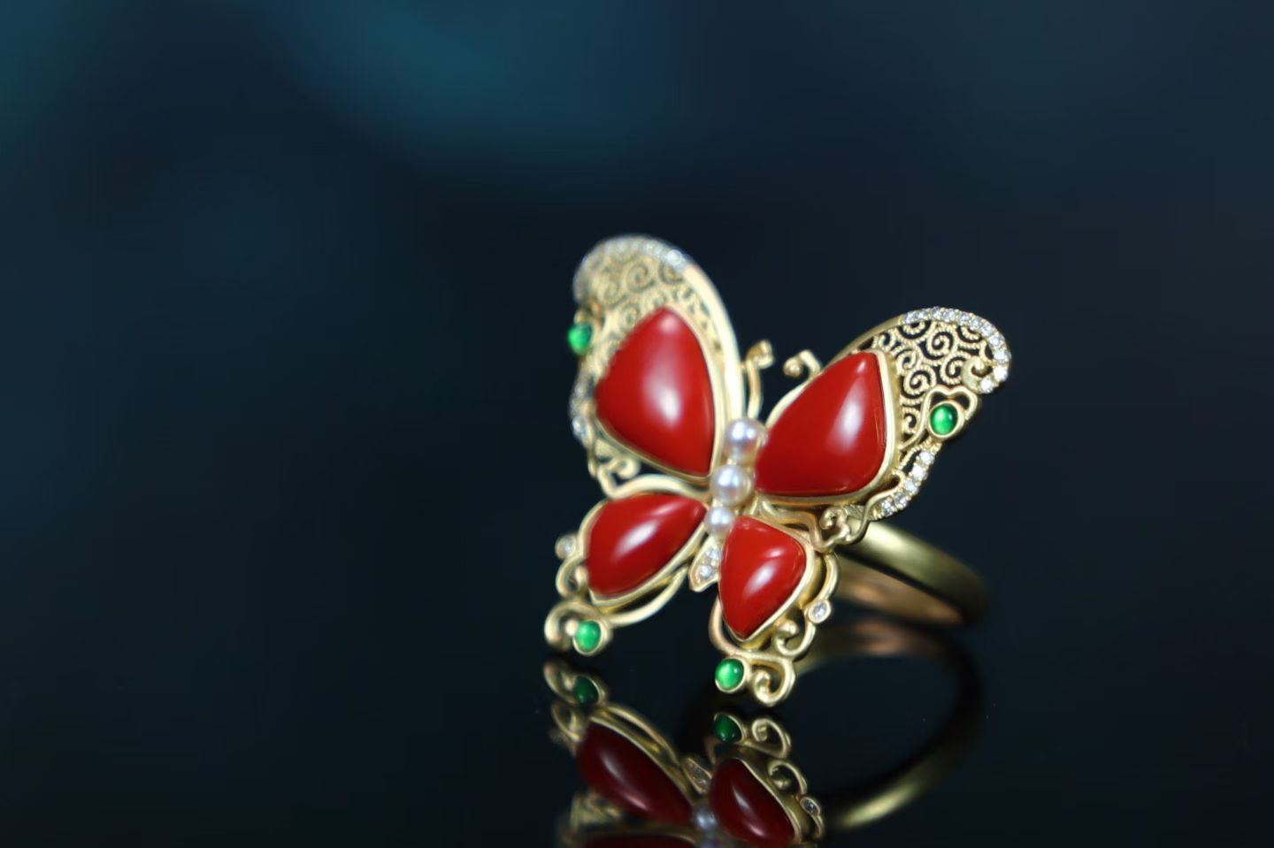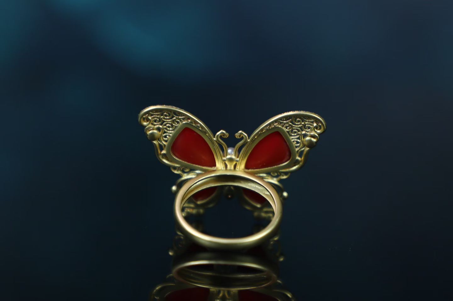 Red Agate 18k Gold Inlaid Butterfly Jade Ring
