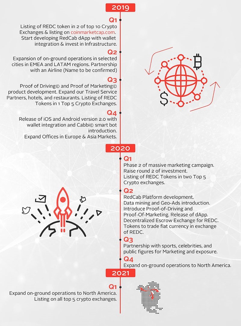 The goal of RedCab's token sales is to transform our business model from a centralized, centralized application that allows access to global reach and reduced transportation costs for people. use. Saving over $ 60 billion annually through intermediaries, raising funds to develop our infrastructure, and addressing the growing international demand for global transportation services through development. A powerful extensible tool.