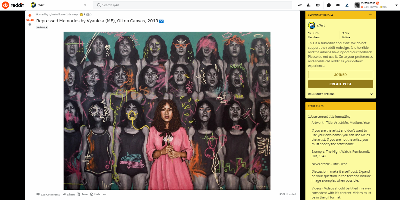It was until OCD launched their OCD Sharing is Caring Initiative, which encourages Steemians to share their Steem posts on Reddit, that I decided to post my art on Reddit and hopefully get their attention and share my Steem profile with them (to increase Steem's visibility). I posted my "Repressed Memories" painting on the subreddit r/art as an image. I just thought if you post direct links on Reddit, it won't get as much attention compared to an image file. Besides, this subreddit has a rule that it should be a direct image/video file.