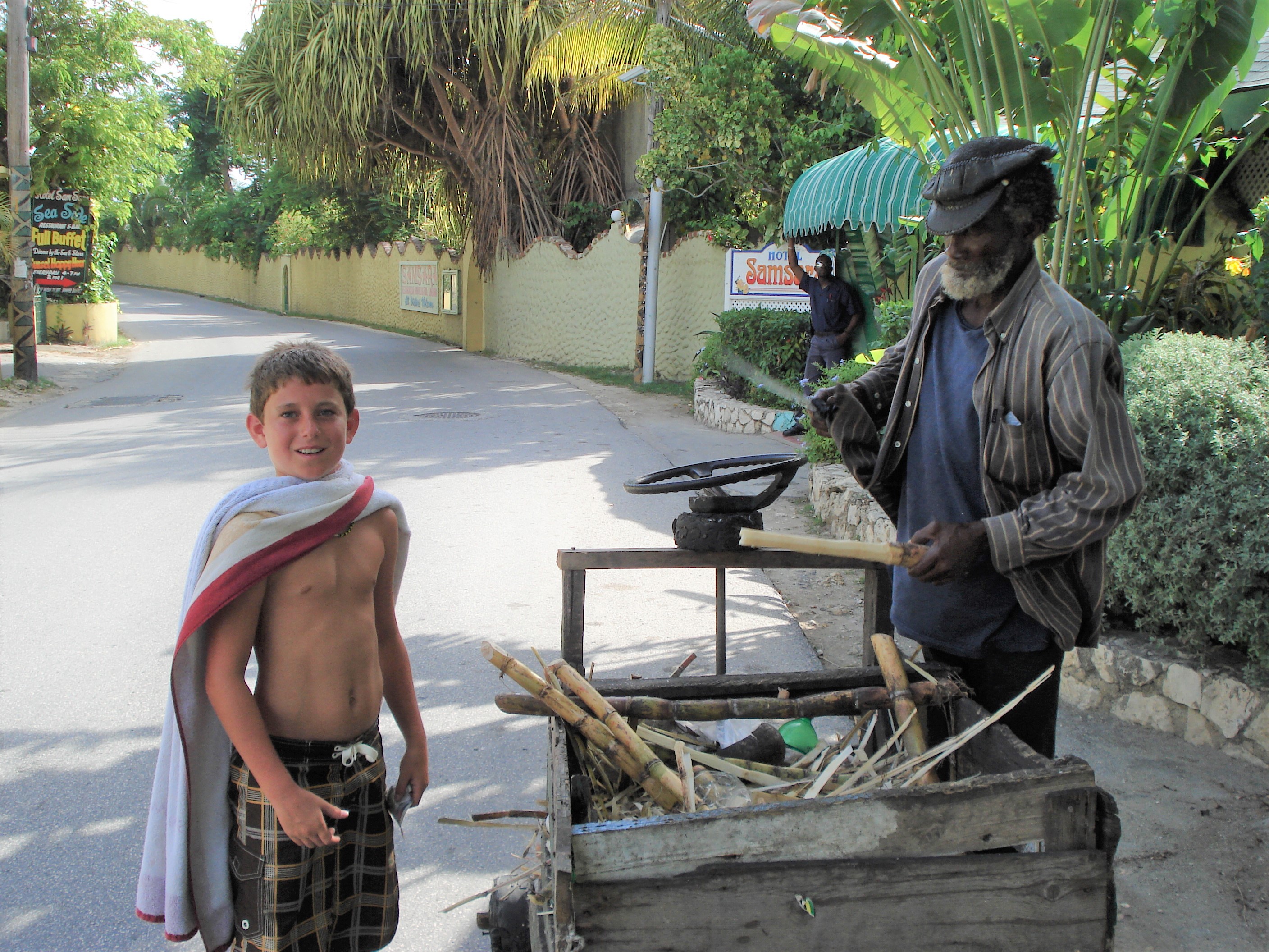 So here it's 2007, and guess what - nothing has changed. Accommodations are still Samsara on the cliffs and we are staying in a roadside bungalow. One day, as we crossed West End Road, looking both ways multiple times to check for fast paced oncoming traffic around the slight bend in the road to the left, here comes an older gentleman wheeling an old wooden card filled with sugarcane. How cool.