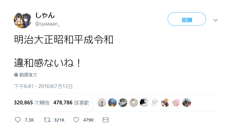 日本網友しゃん(@syaaaan_ )在twitter上的一個舊post被瞬間推爆,原因是裡面所寫的「明治大正昭和平成令和 違和感ないね!」,100%準確預測了新年號是令和,而發佈時間竟是2016年7月13日,當時天皇已宣佈了生前讓位,但應該沒太多人留意年號的事。
