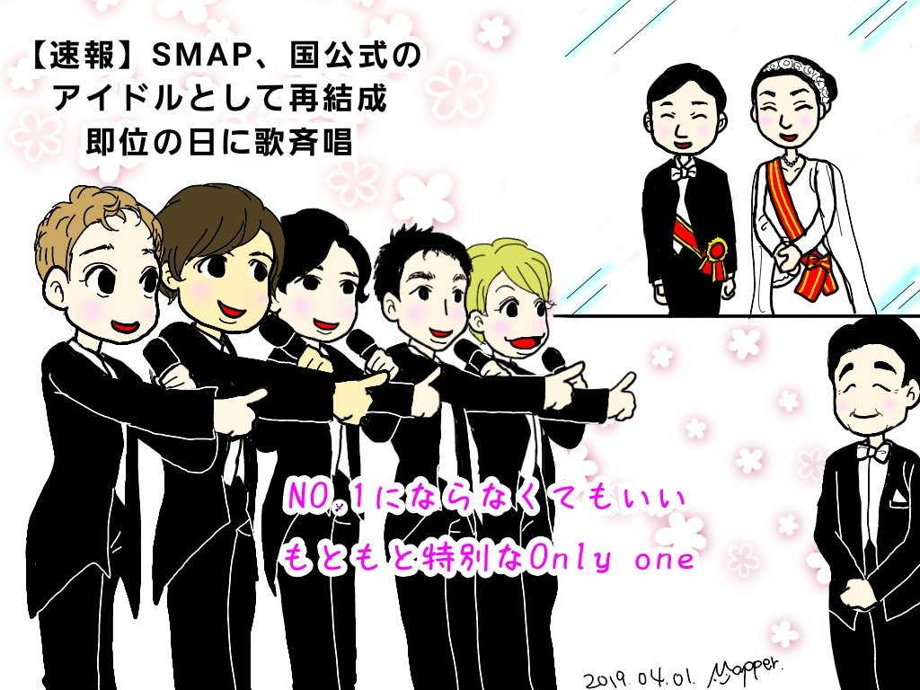 報道一出,立即觸動到SMAP飯的神經,還有人畫了張圖,期待SMAP在天皇即位之日再度集結唱國歌,當然大家也明白,這只能是愚人節的妄想吧。