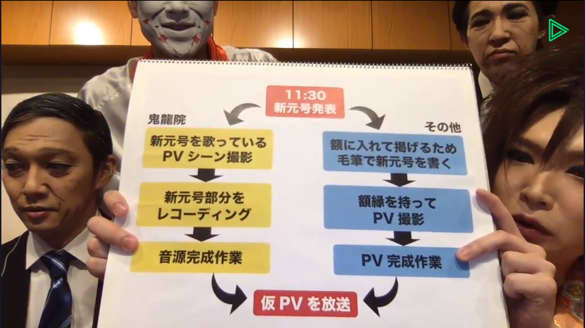 但事實正好相反,這一切都是金爆的精心安排。他們跟普羅大眾一樣,都是要靠現場直播,才能知道新年號。在確定是「令和」後,便匆忙灌錄歌曲(就「令和」兩個音)和補拍舉牌片段,再填進早已拍好的MV空白位之中。他們還把整個製作過程進行直播,見到他們裙拉褲甩的趕工模樣,相當搞笑。