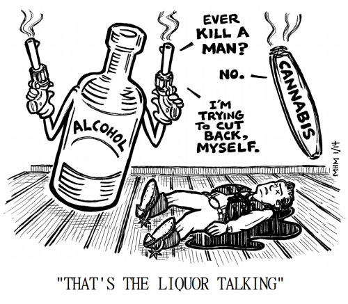 I neither drink nor smoe Marijuana myself and usually don't associate with people who do, not by choice, it just happened that way, but from what I can tell, the latter seem to be way more relaxed than the former. Both stink terribly, though. Seriously, those smells kill me.