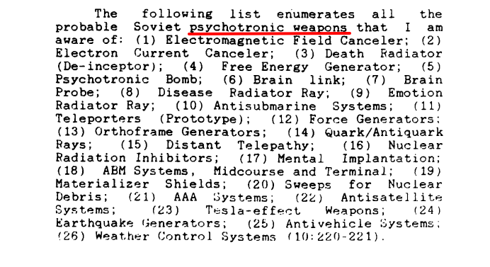 - Weapons (electro-magnetic, psychotronics)