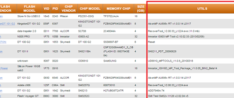 En http://flashboot.ru/iflash/ ingresamos el VID y PID, click en "search", y vamos la pestaña "Utils"
