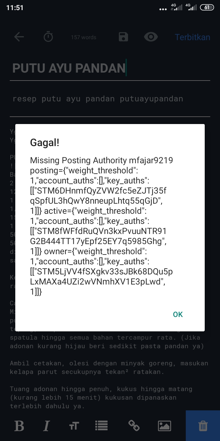 Ada yang bisa bantusteemCreated with Sketch.mfajar9219 (25)in #resep • 6 years ago (edited)Saya mengalami masalah dalam memposting Masalah nya seperti berikut #putu #ayu #pandan