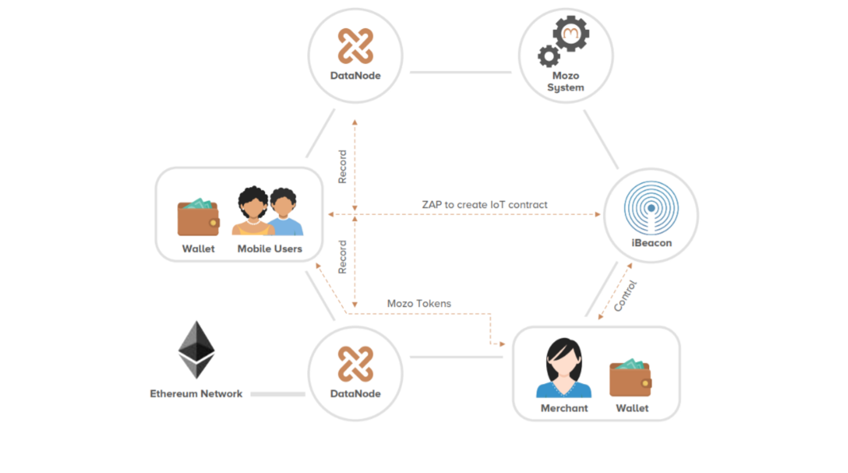 Mozo는 소매 활동과 관련된 "스마트 계약"을 사용하여 작동합니다. 이 스마트 계약은 리셀러 스마트 폰이나 IoT 장치 (발리스와 같은)와 소비자 스마트 폰이 각각의 장치를 감지 할 때 이루어집니다.