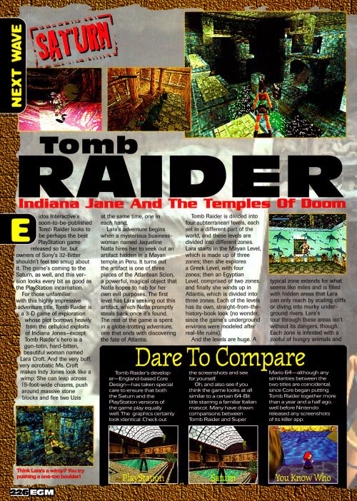 The Sega Saturn didn't last long enough to see the sequels but it was one of the original systems to host Tomb Raider. This is a preview of the game from EGM.