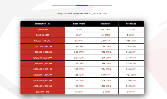 - Block reward: 3 CSPN (annually decreasing by 6.7%)