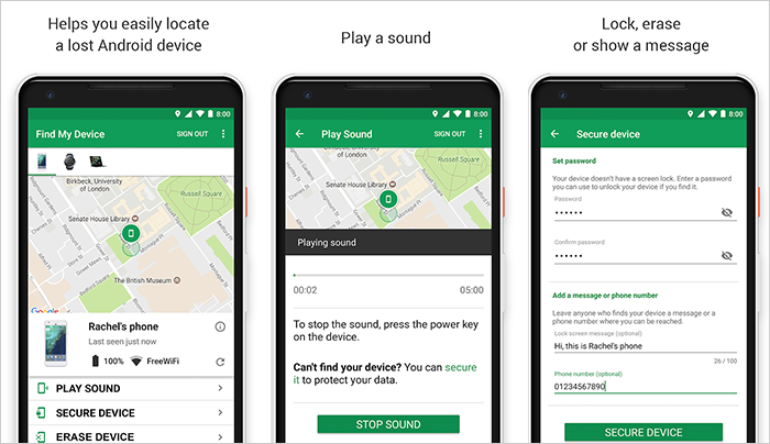 Track your phone with Google Find My Device, an application that lets you find your Android phones, smartwatches, and Android tablets in case they are lost somewhere or stolen by someone.The app keeps you completely updated about your device’s battery life and location, last seen while allowing you to play and stop sound on your device. The user can even secure their device by adding a password or erase their device’s data.