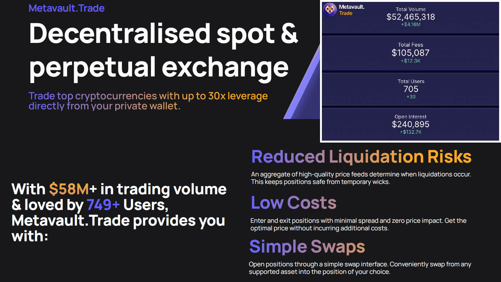 Metavault.Trade is an exchange platform that provides decentralized crypto exchange services designed with various crypto features. Metavault.Trade provides spot & perpetual exchange services that allow users to trade with up to 30x leverage and directly from their personal wallet.