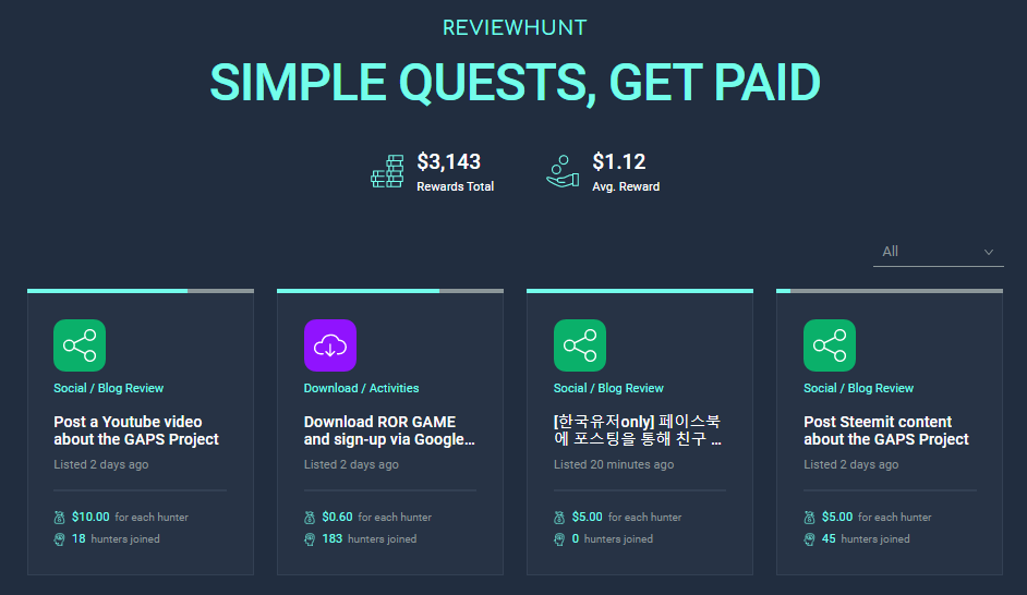 ReviewHunt offers you the opportunity to earn money, performing tasks of this type. Today there are large companies wanting to be known to sell more products, or airdrop that need participants, Reviewhunt will pay you to participate and fulfill the tasks or rather, they will pay you to hunt tasks, let's get more into the matter.