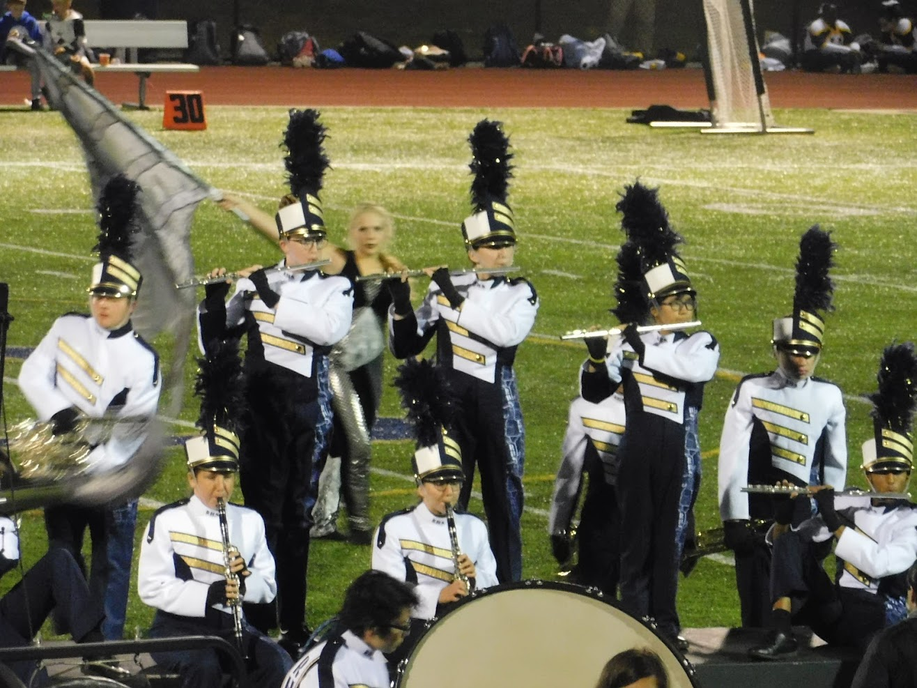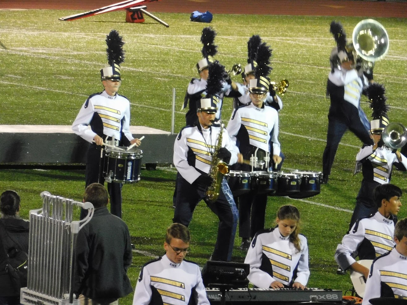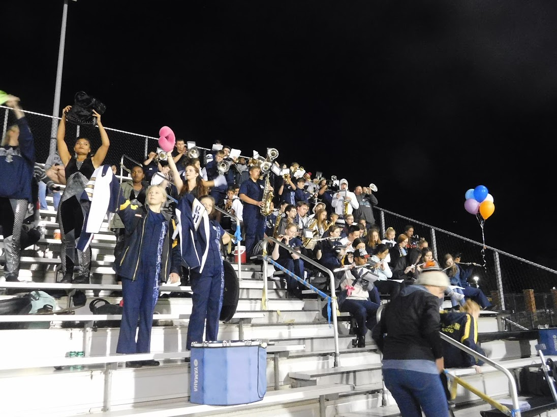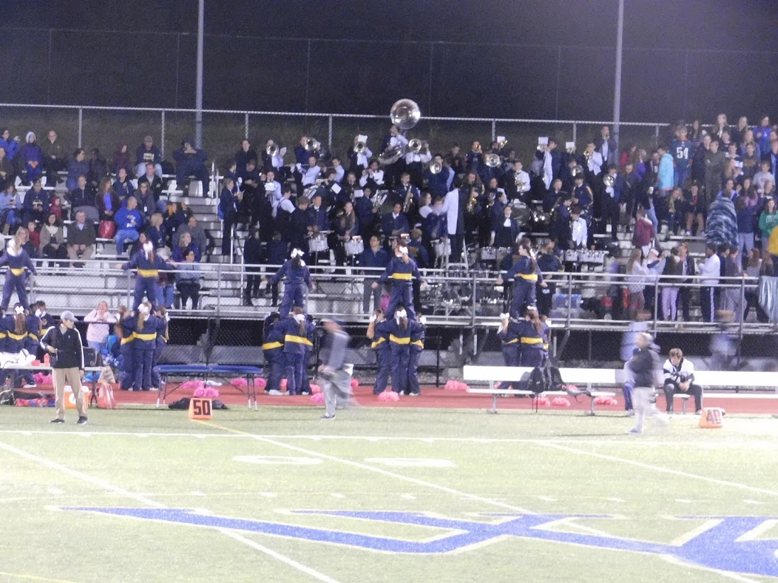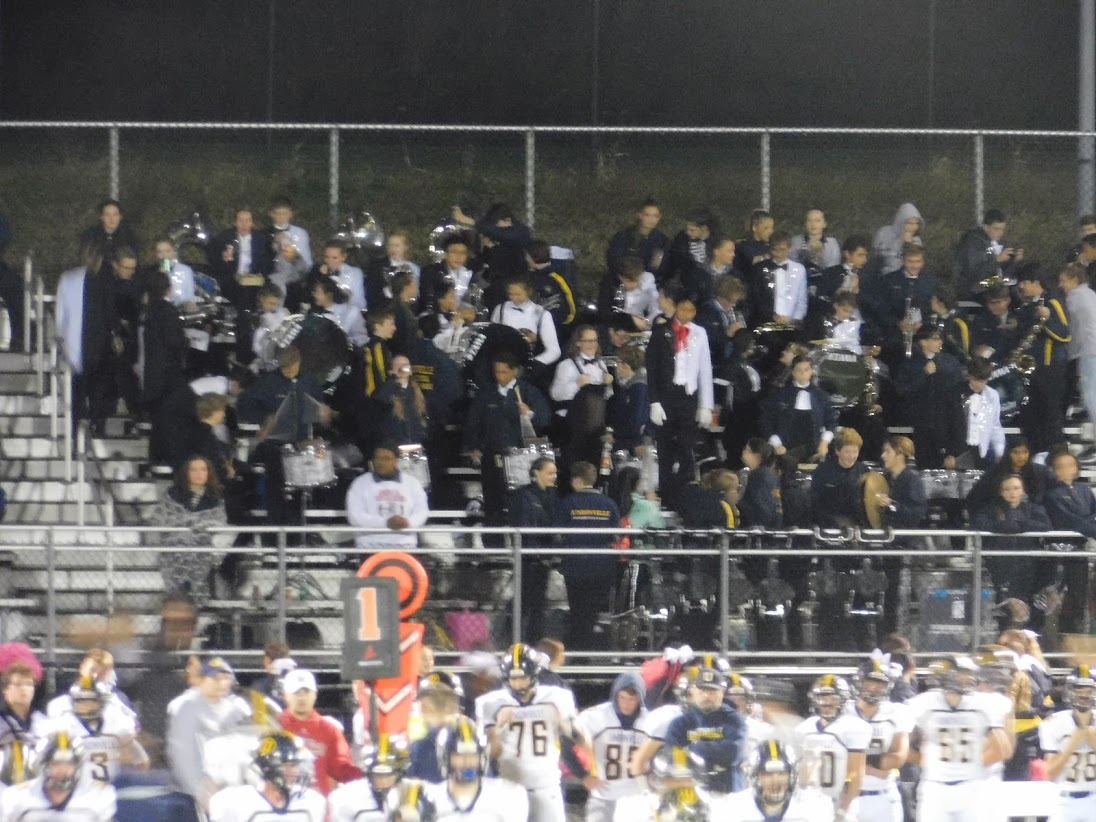 Tonight was a special game night for a variety of reasons. First, as noted in the title, it was Rustin's Homecoming game. To celebrate homecoming, many past graduates come to watch the game, and the marching band was joined in the stands by a number of alumni, including at least two former drum majors. Additionally, the marching band was joined in the stands by 8th grade students from the local middle school, and also by members of the school concert bands, who don't normally come to the football games.