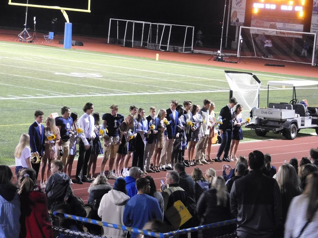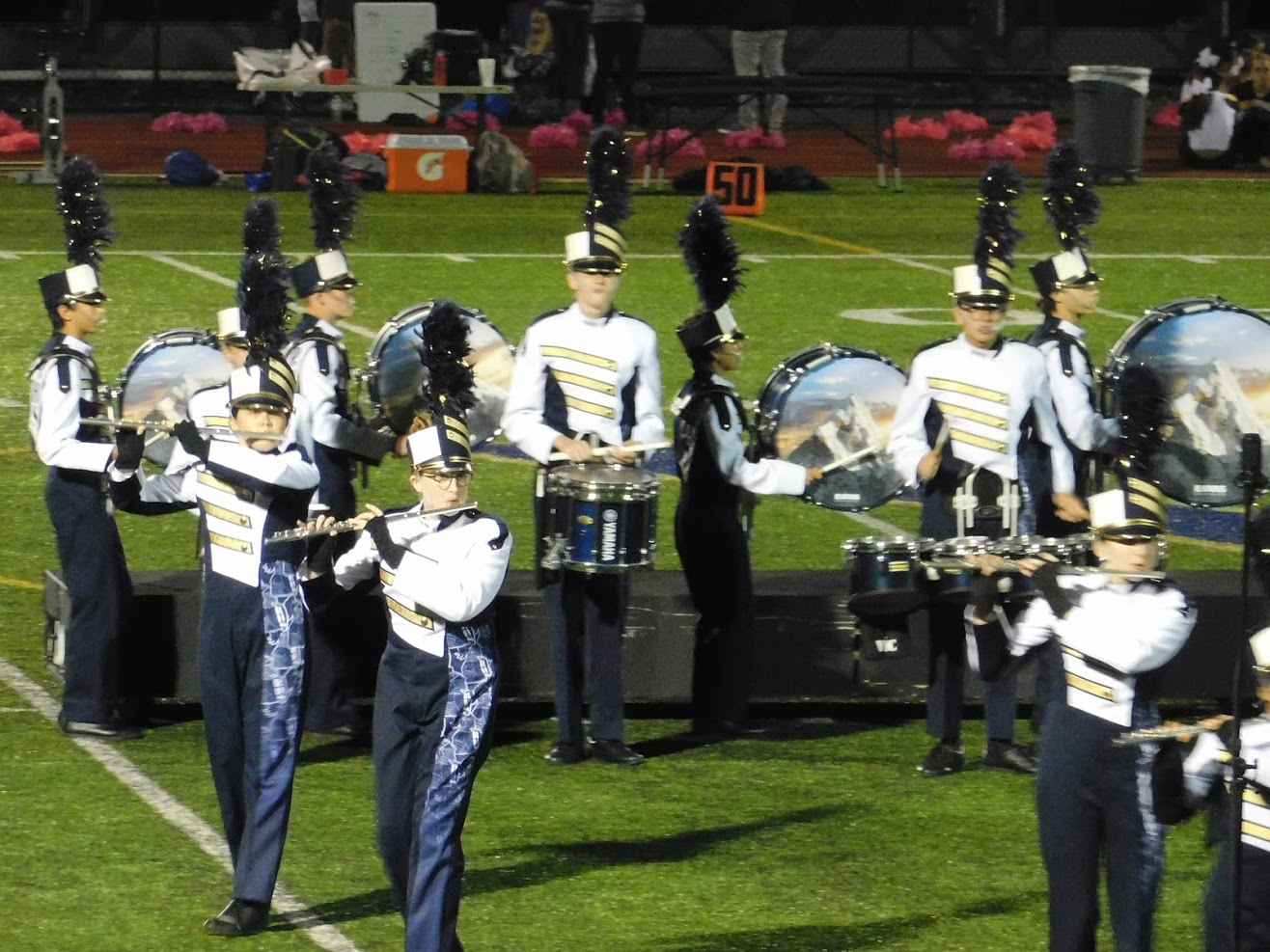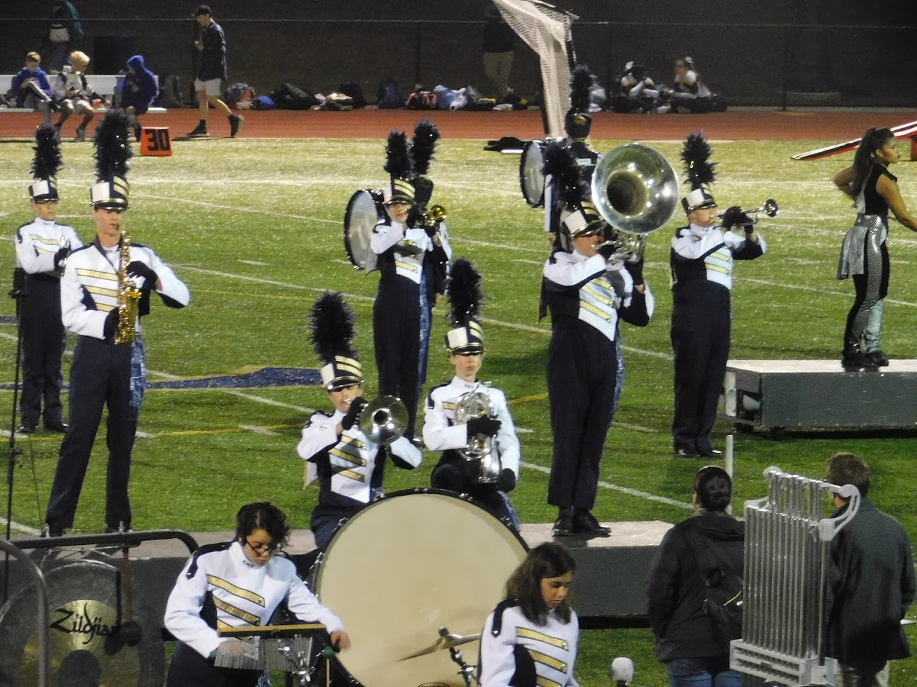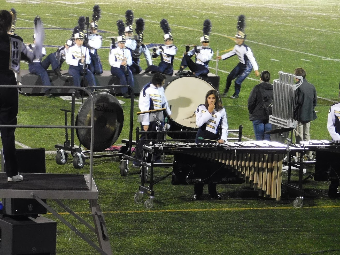 Tonight was a special game night for a variety of reasons. First, as noted in the title, it was Rustin's Homecoming game. To celebrate homecoming, many past graduates come to watch the game, and the marching band was joined in the stands by a number of alumni, including at least two former drum majors. Additionally, the marching band was joined in the stands by 8th grade students from the local middle school, and also by members of the school concert bands, who don't normally come to the football games.