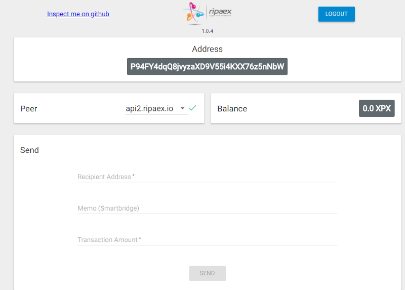 The Ripaex project has its own separate purse, which I also suggest you get right away. After registering in the wallet, you will be given a personal purse address where your XPX tokens will be stored. Type of personal cabinet WEB wallet is provided below. Also on the site you can download the version of the purse for the computer and mobile phone.