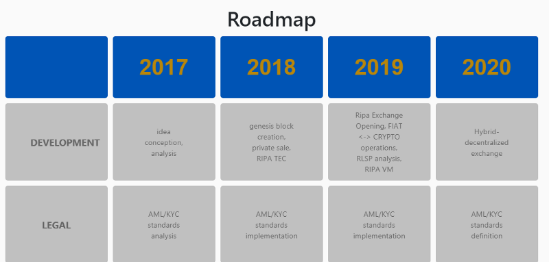 The road map on the Ripaex website is executed in a rather interesting way. The idea of the project was born in 2017, and then the work on the project began. In the same year, an analysis of legal issues on the development of the project began. In the future, as early as 2018, versions of wallets were released, and tokens were also sold. In 2019, the full launch of the Ripaex. And already in 2020, the full-fledged launch of a hybrid crypto exchange is planned.